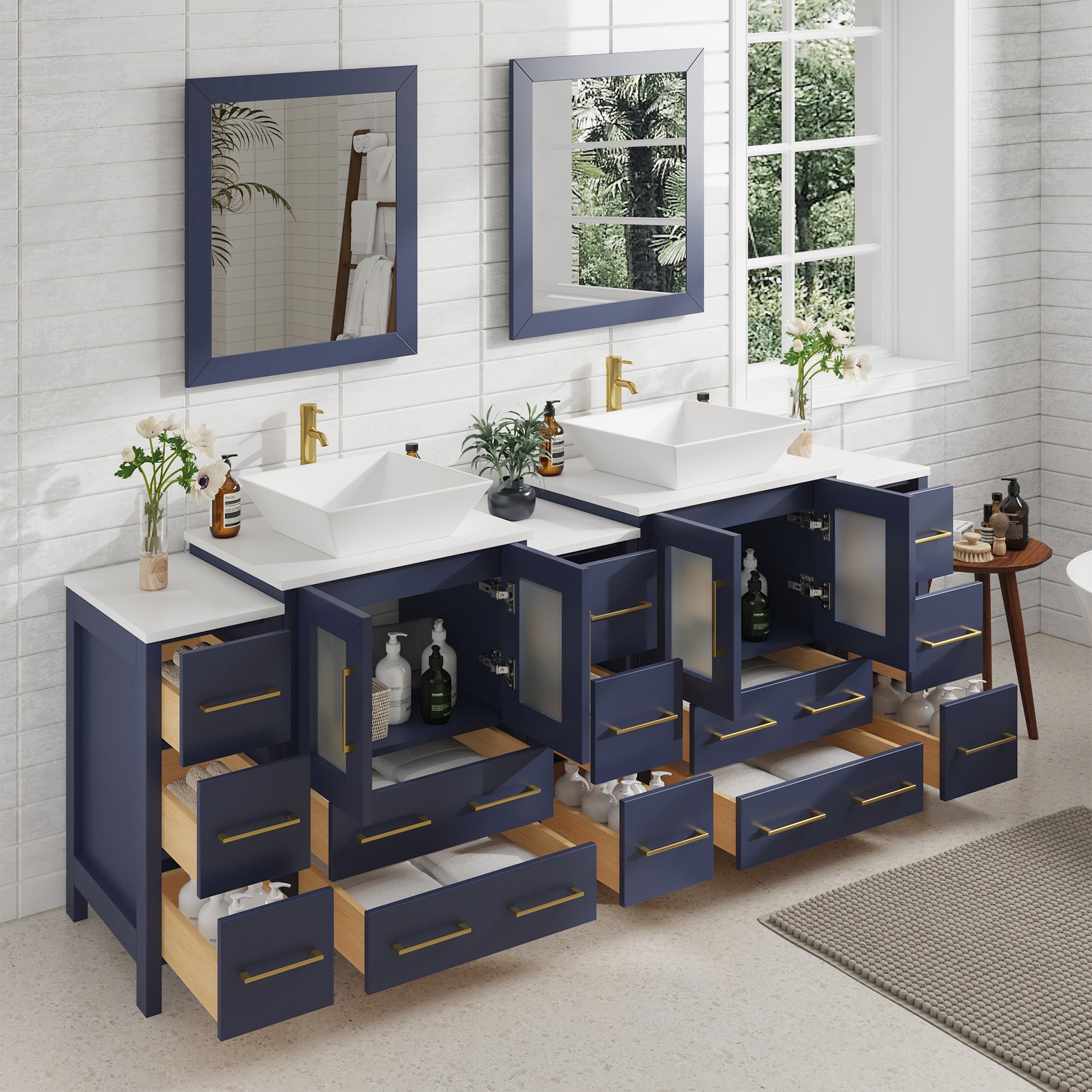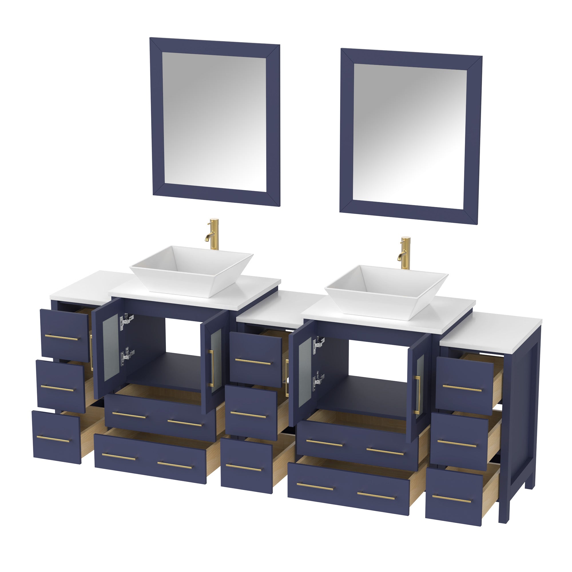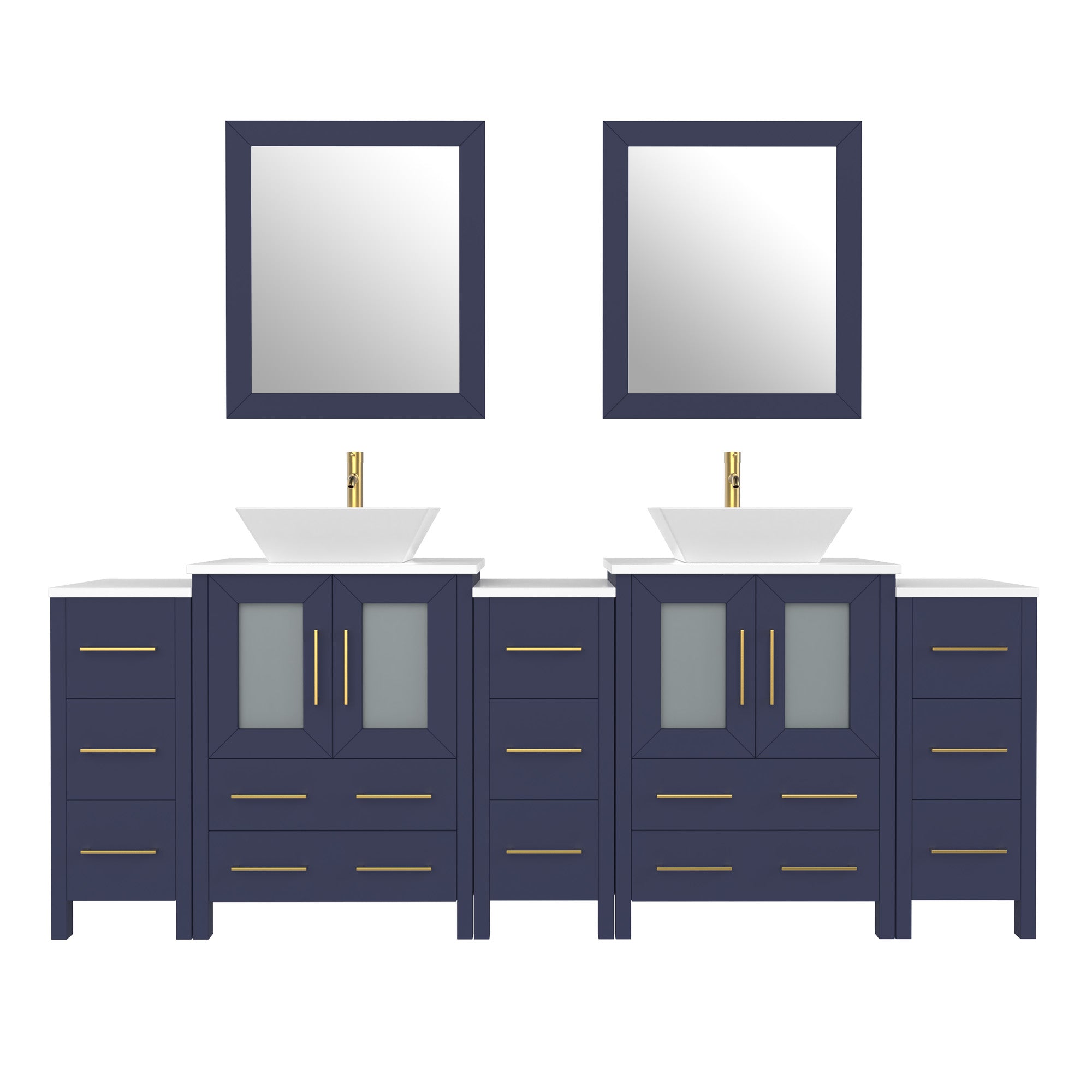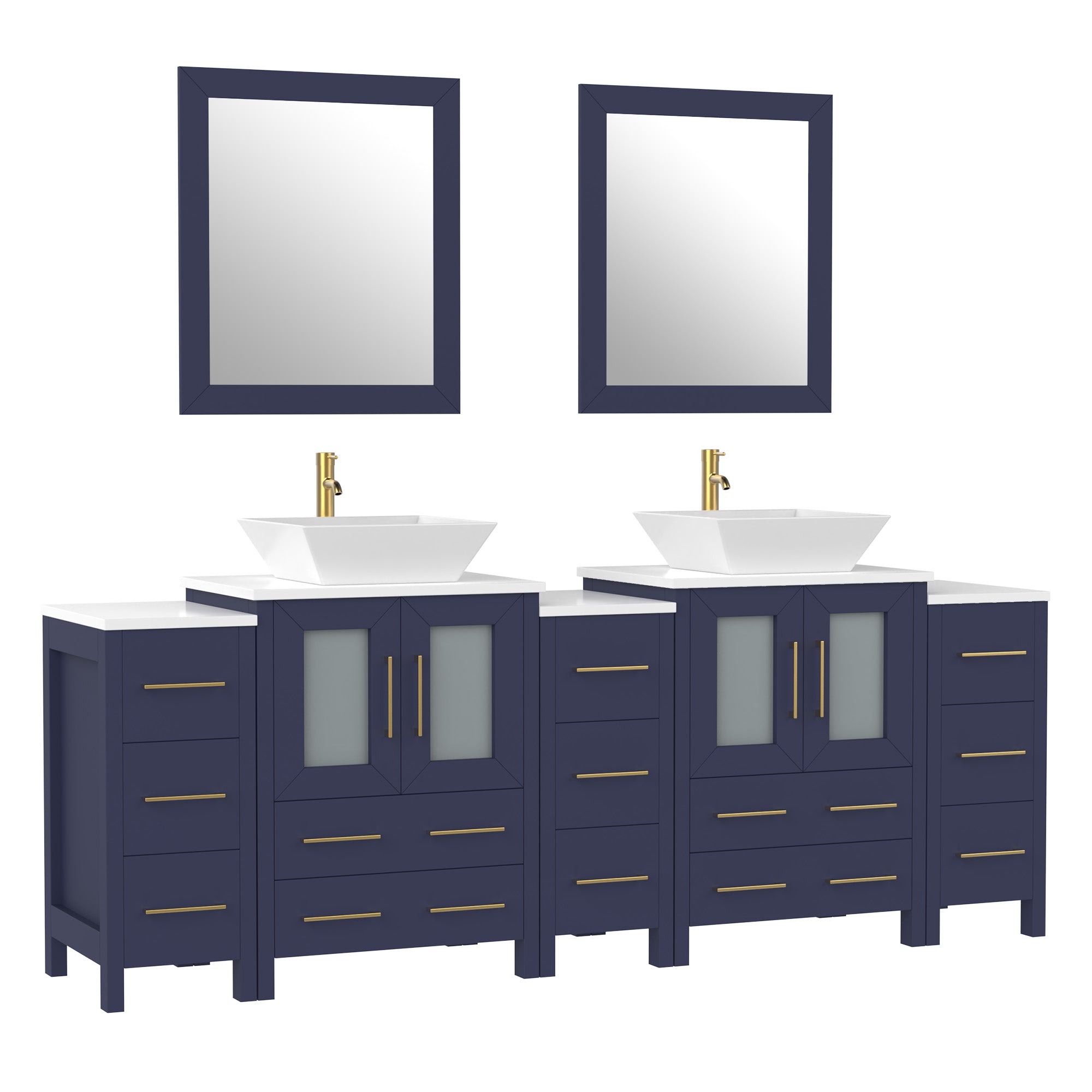 Vanity Art Monaco 84" Double Vessel Sink Bathroom Vanity Set with Sinks and Mirrors (Engineered Marble Top) - 3 Side Cabinets