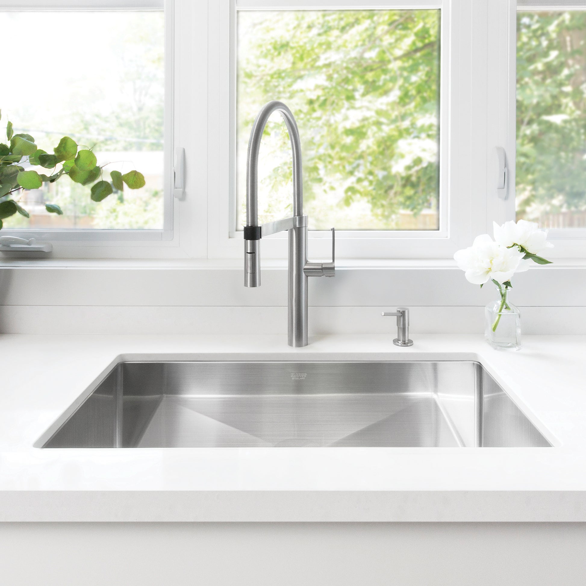 Enjoy the art of precision in every detail with the PRECISION R10 32" Single Bowl Undermount Stainless Steel Kitchen Sink. the PRECISION R10 32" Single Bowl Undermount Stainless Steel Kitchen Sink is ideal for busy kitchens thanks to its spacious single bowl configuration that allows for easy washing of large pots and pans. German-engineered with corrosion-resistant stainless steel for long-lasting durability and 10 mm corners for a modern look Ñthe PRECISION R10 32" demonstrates BLANCO's commitment to premium quality. Combine the PRECISION R10 sink with a BLANCO faucet and accessories to create a BLANCO UNIT; a seamless, fully-integrated kitchen solution designed to transform kitchen chores into joyful experiences. Everything you need to drink, prep and clean, all in one place.