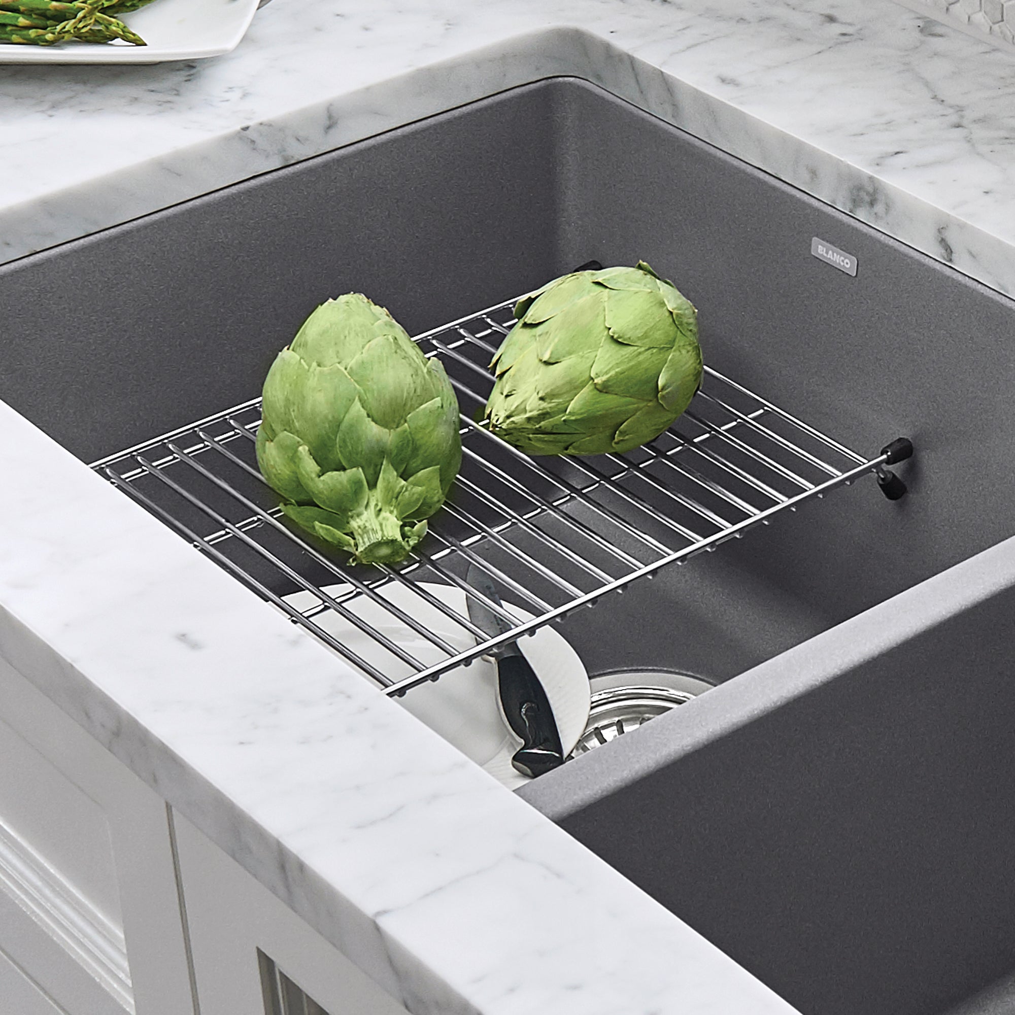 The BLANCO PRECIS FLOATING SINK GRID is a patented design which gently floats 5" above the sink bottom, and can be used as a second sink level for cleaning and prepping. It is strong enough to hold the weight of heavy pots and pans, making using your BLANCO sink that much easier. the grid can also be used as a countertop trivet for hot pots and pans. Add functionality and beauty to your kitchen with our high-quality floating grids.