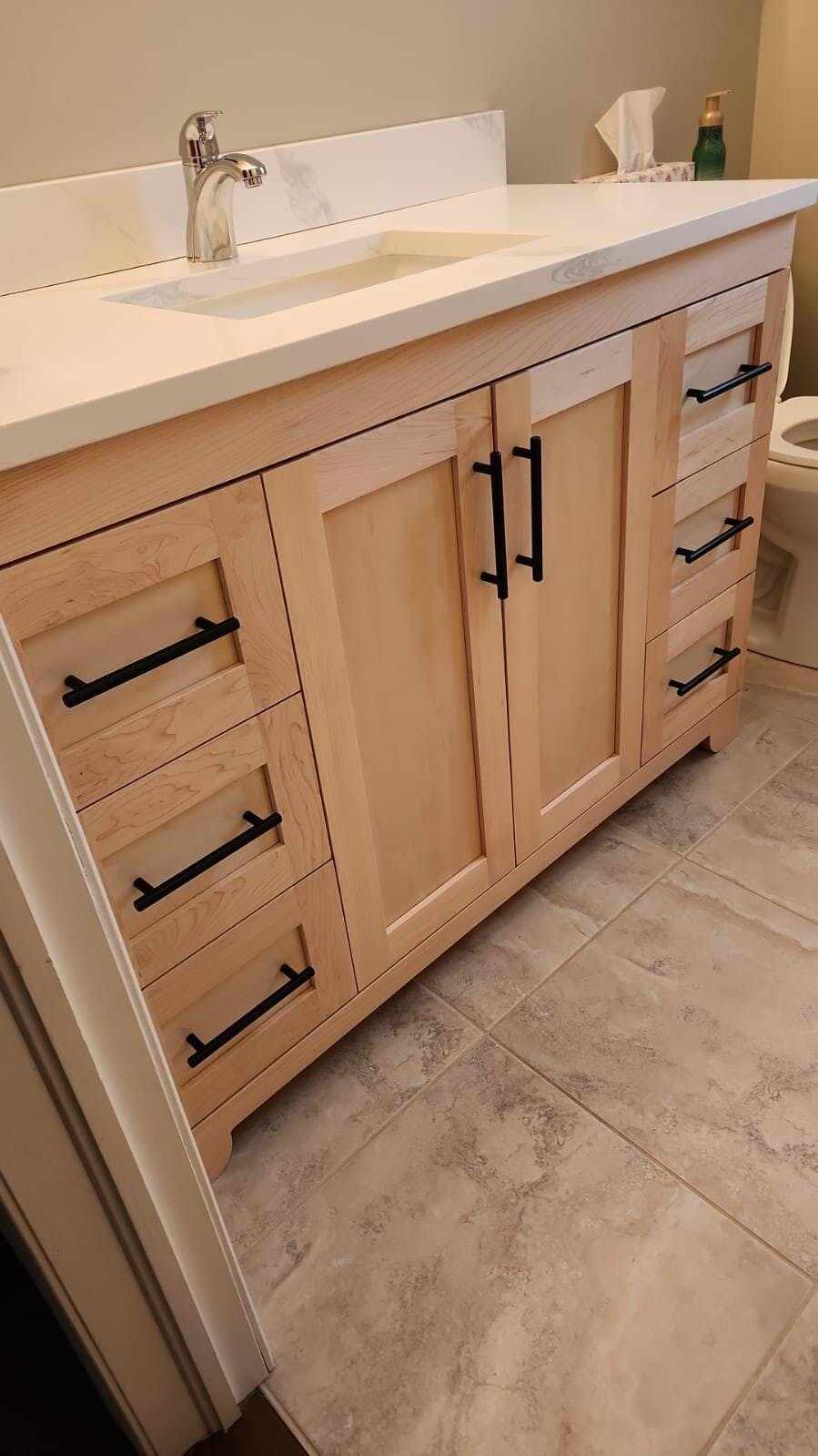 With wood construction and a natural maple finish, this series is sure to leave your bathroom looking modern and stylish. Boasting a 3cm pure quartz countertop, this unit is built to last and leave an impression. Fully soft closing drawers and doors are available on all sizes within this collection. The cabinet comes fully assembled and can be customized with countertop spacing and hardware options. Faucet and mirror not included.