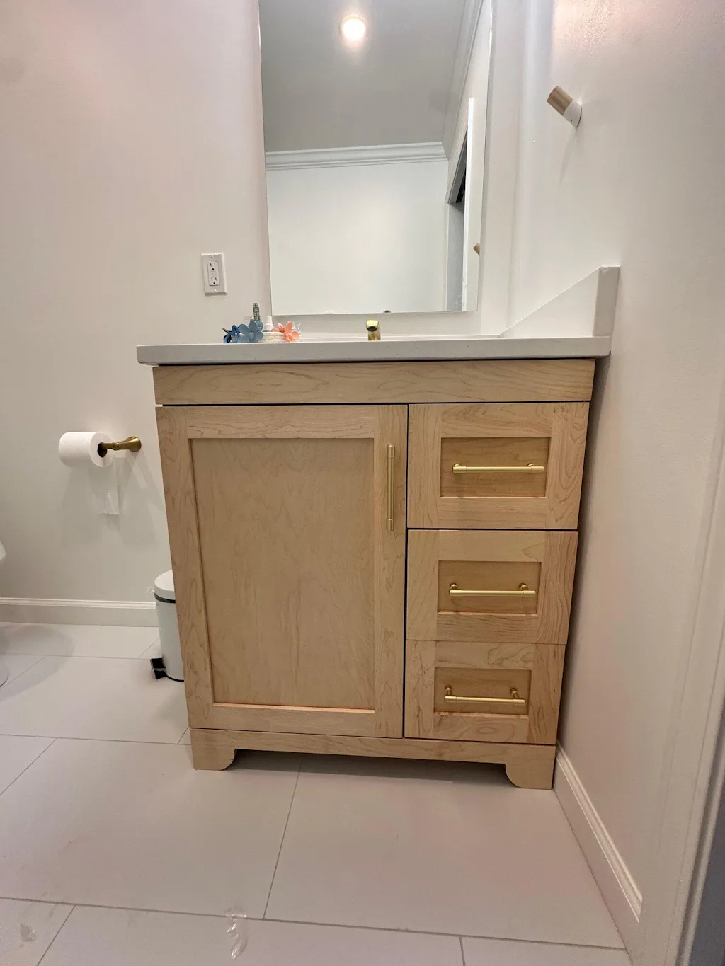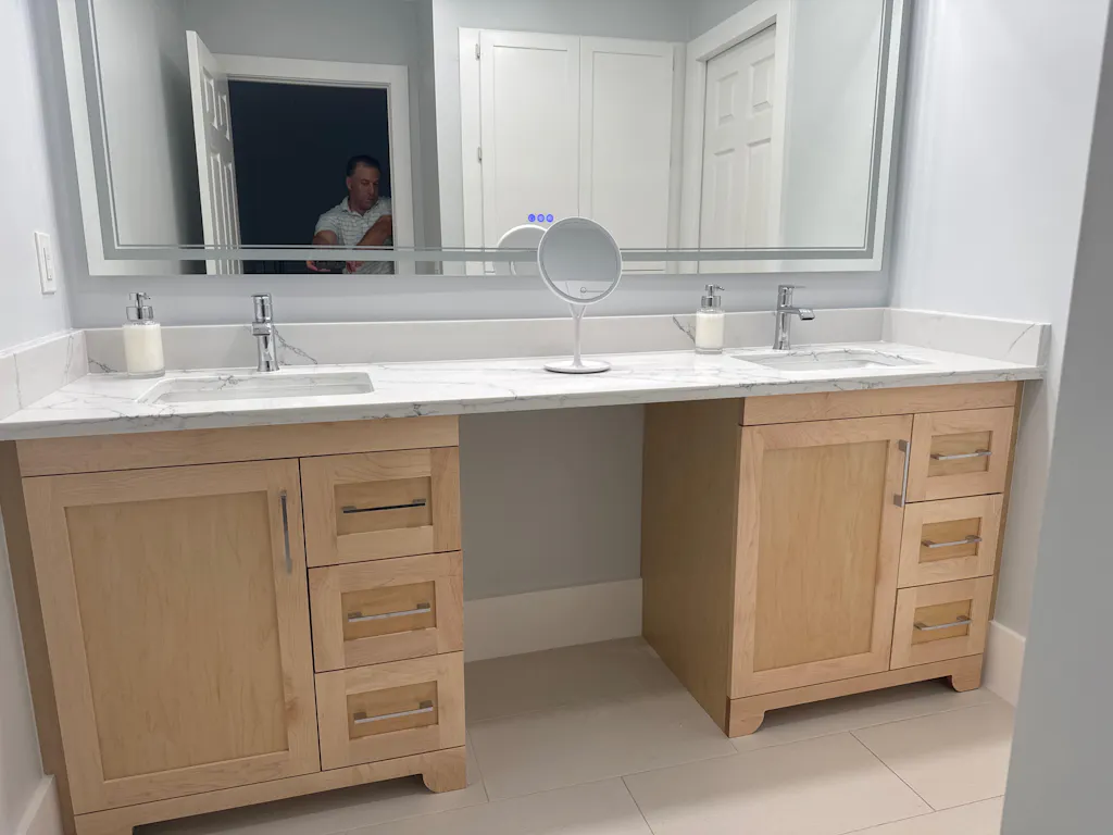 With wood construction and a natural maple finish, this series is sure to leave your bathroom looking modern and stylish. Boasting a 3cm pure quartz countertop, this unit is built to last and leave an impression. Fully soft closing drawers and doors are available on all sizes within this collection. The cabinet comes fully assembled and can be customized with countertop spacing and hardware options. Faucet and mirror not included.