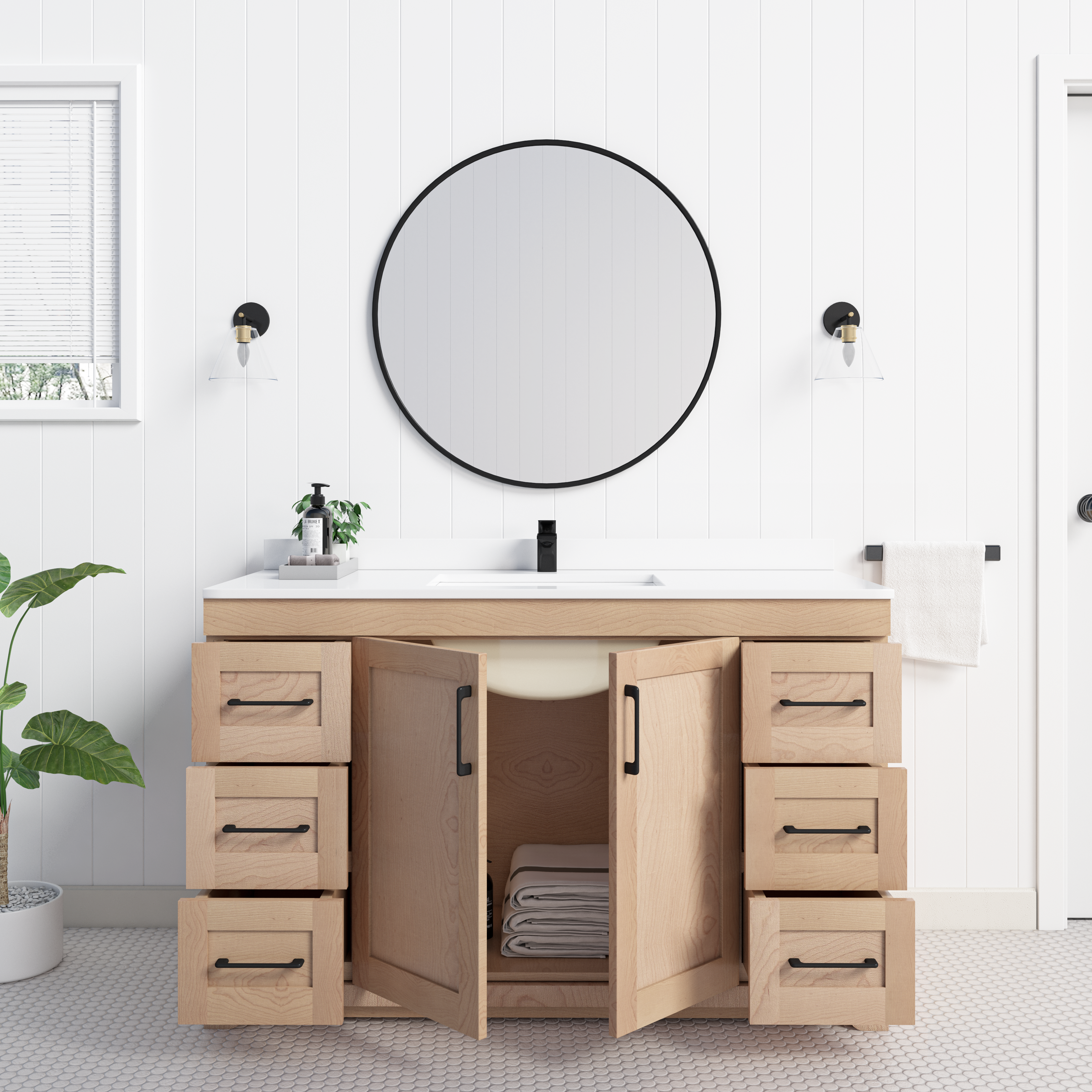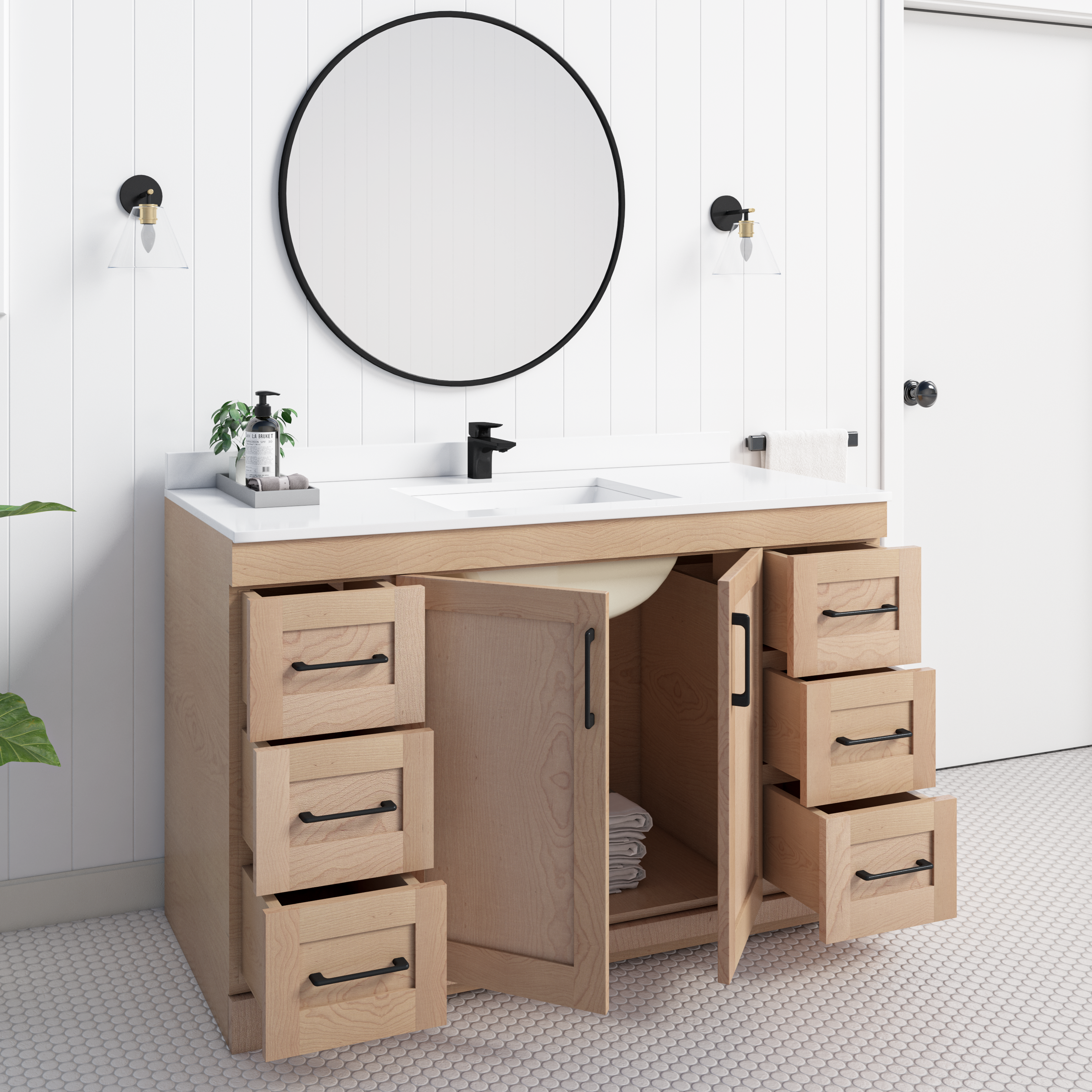 With wood construction and a natural maple finish, this series is sure to leave your bathroom looking modern and stylish. Boasting a 3cm pure quartz countertop, this unit is built to last and leave an impression. Fully soft closing drawers and doors are available on all sizes within this collection. The cabinet comes fully assembled and can be customized with countertop spacing and hardware options. Faucet and mirror not included.
