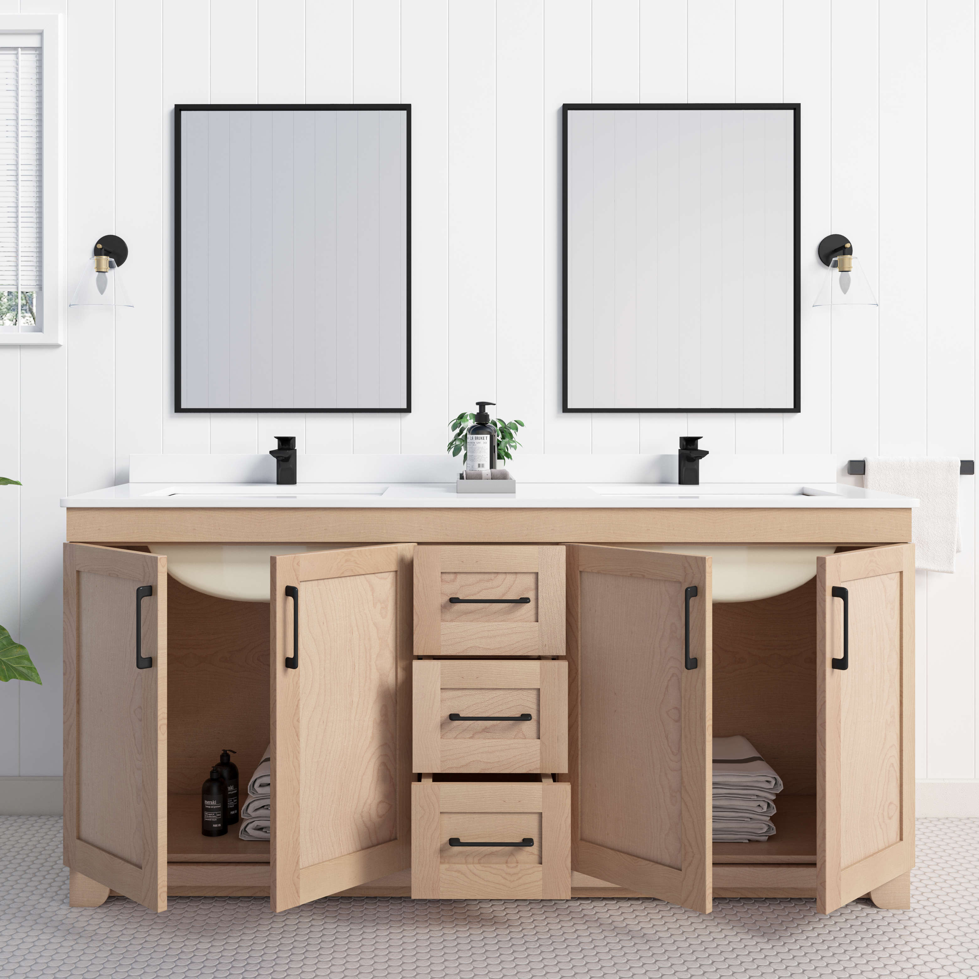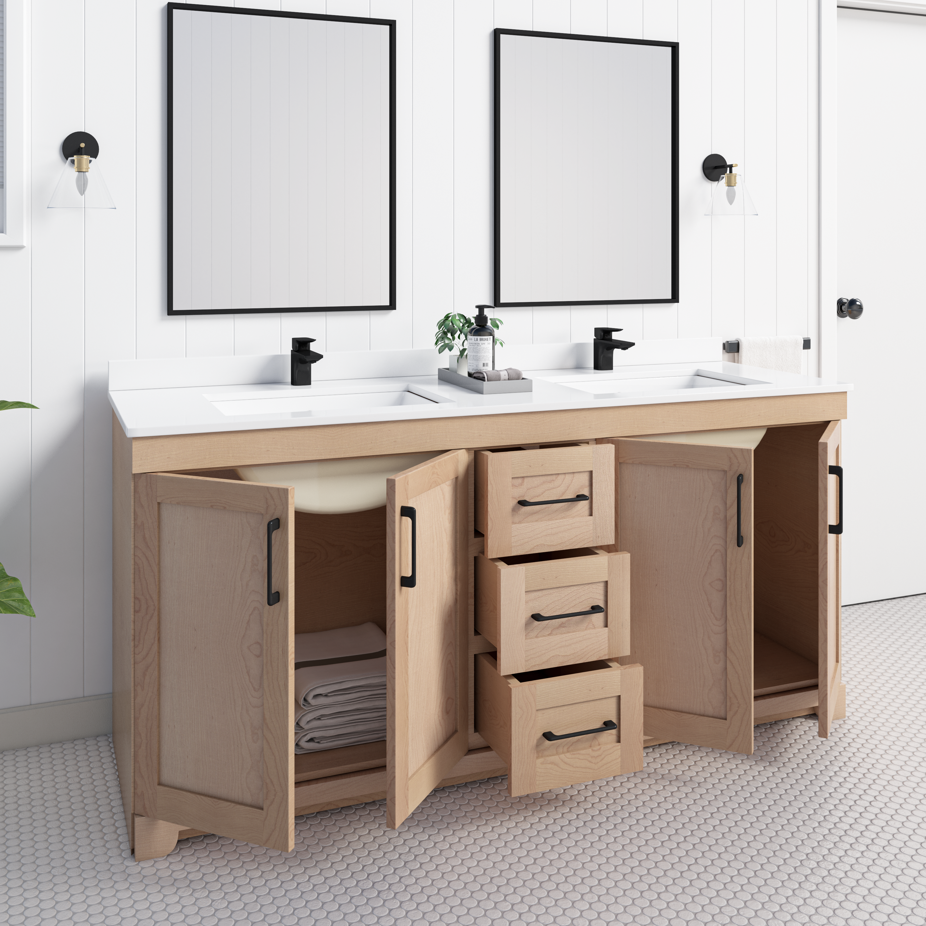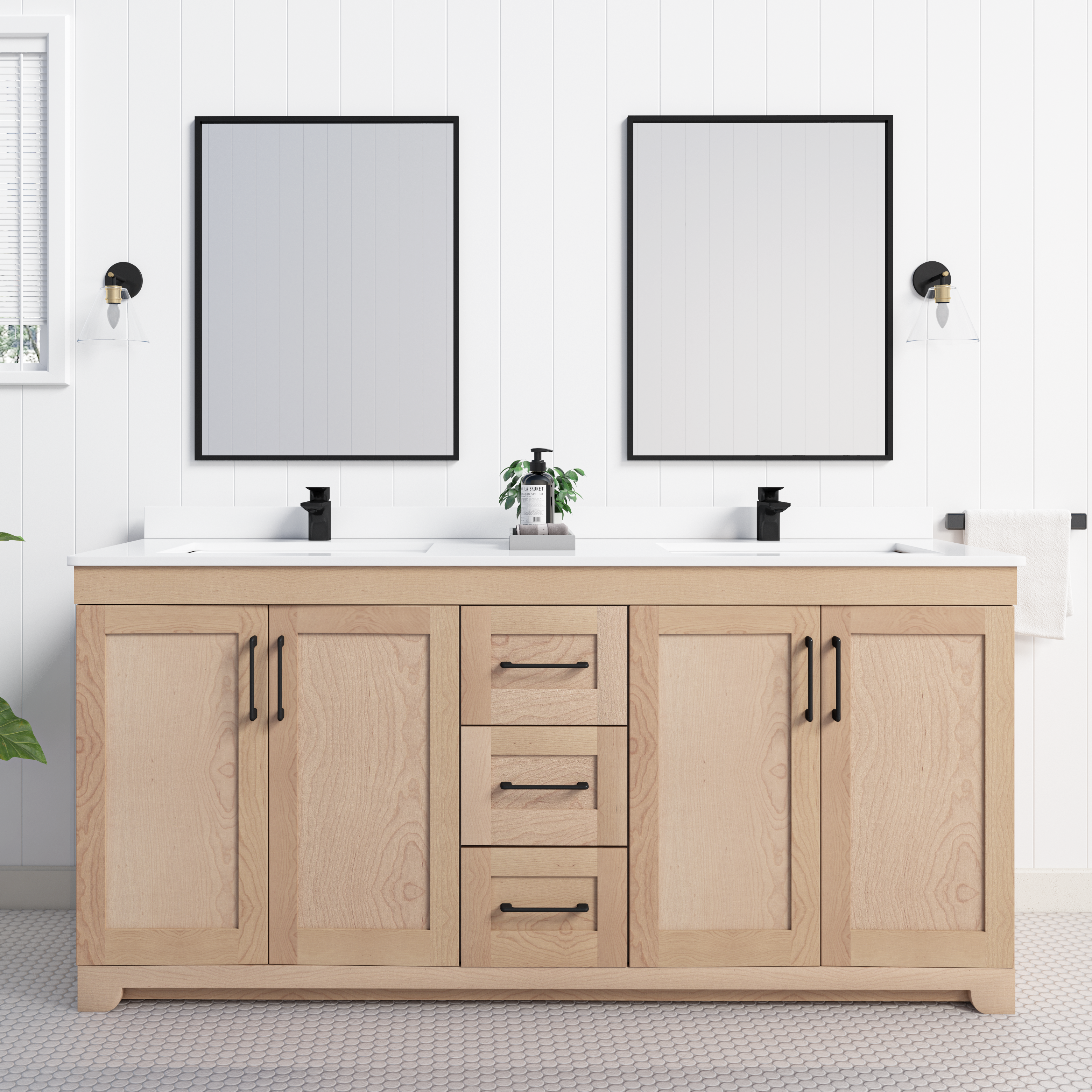 With wood construction and a natural maple finish, this series is sure to leave your bathroom looking modern and stylish. Boasting a 3cm pure quartz countertop, this unit is built to last and leave an impression. Fully soft closing drawers and doors are available on all sizes within this collection. The cabinet comes fully assembled and can be customized with countertop spacing and hardware options. Faucet and mirror not included.