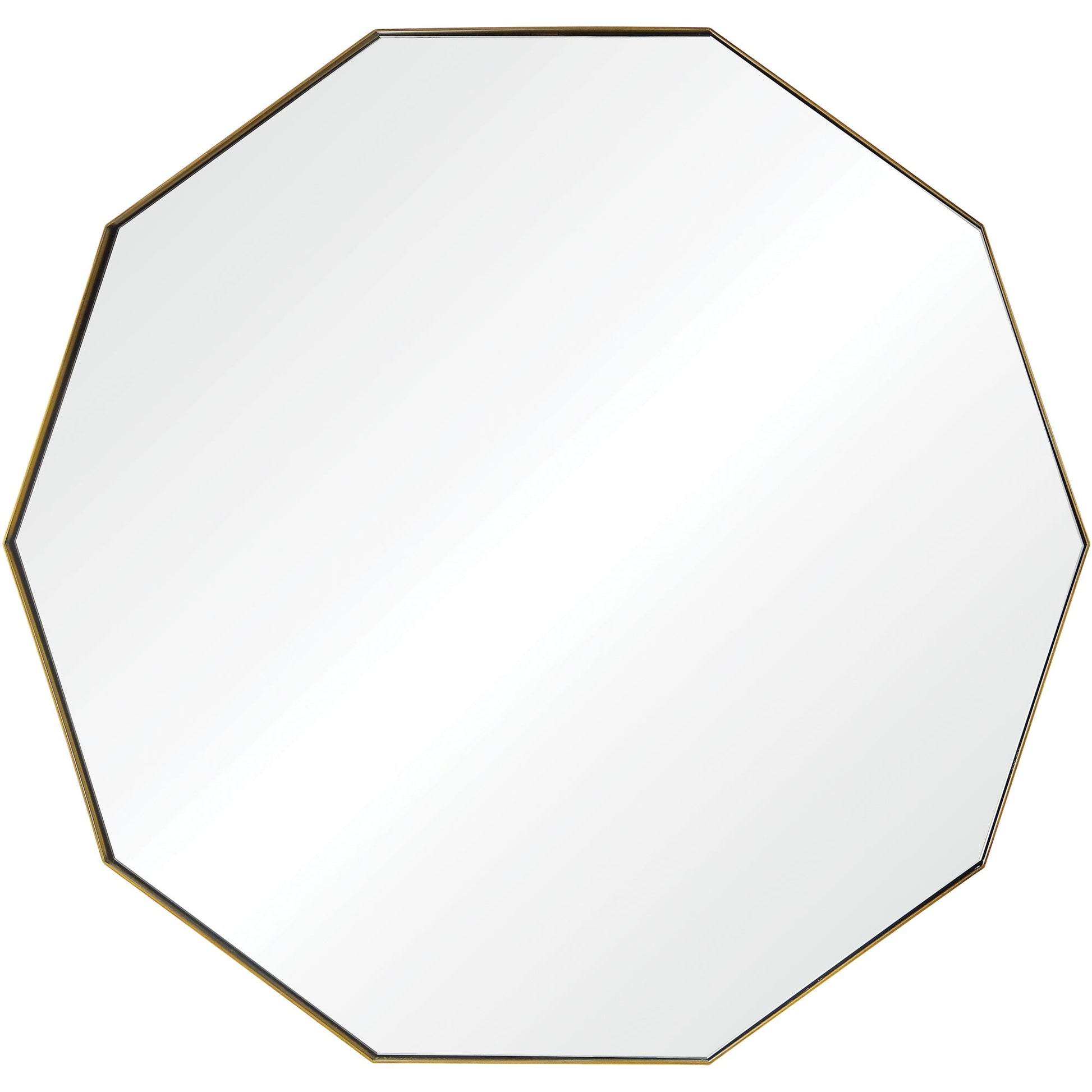 The mid-century powder room interior reaches new heights with this vanity mirror. The antique brass finish brings warmth to the space while the strong angles (10) add a bold quality. Complemented by a vibrant background, it will always remain radiant.