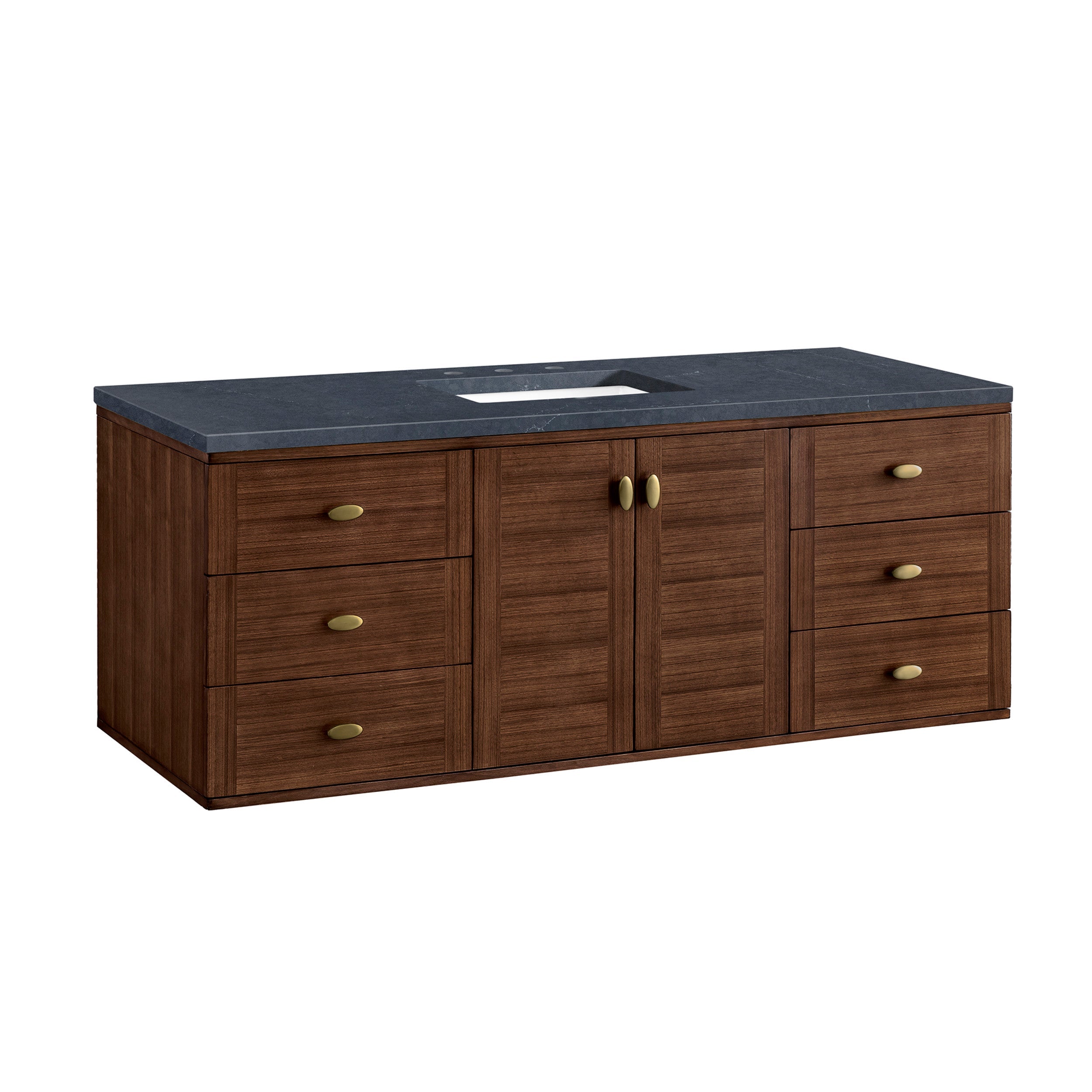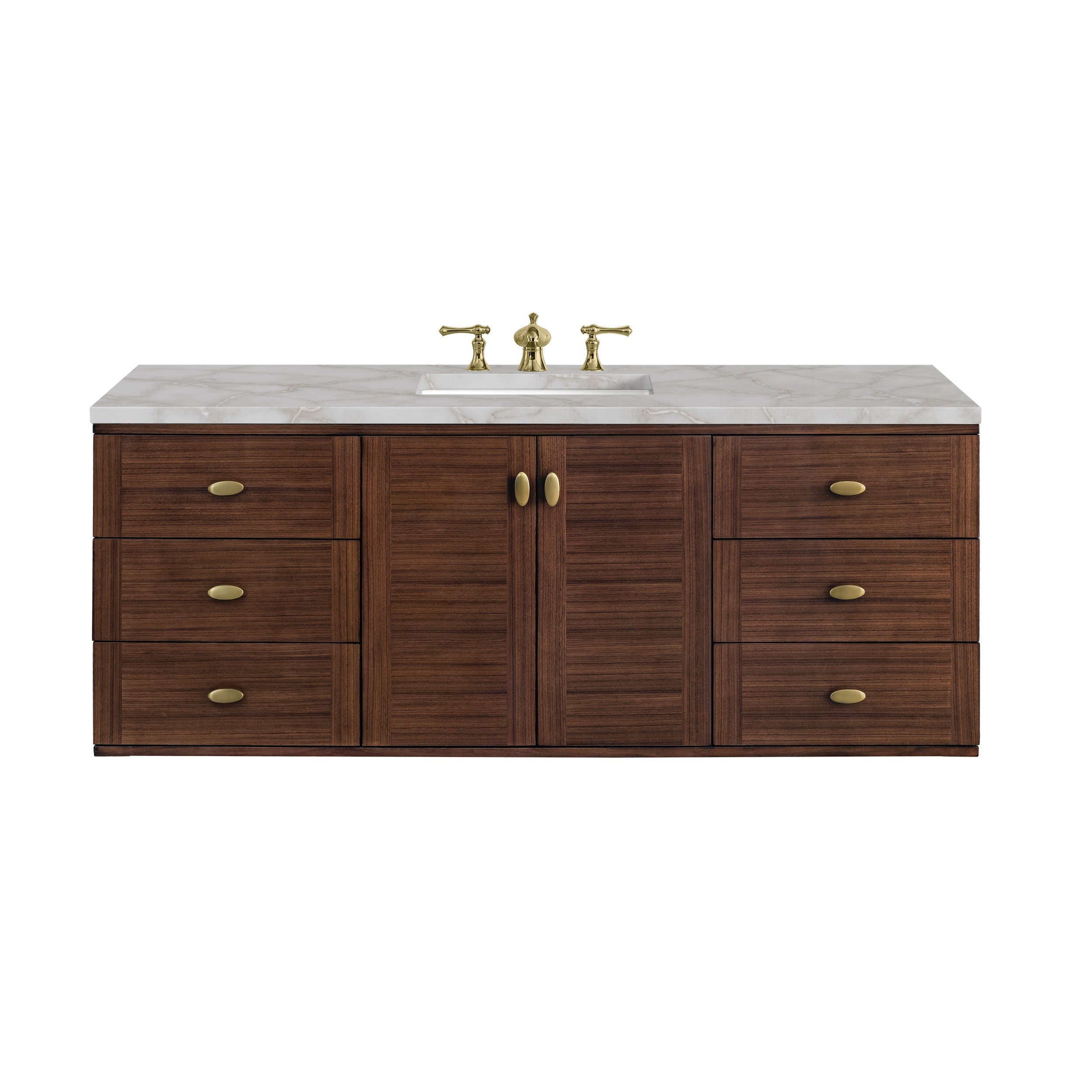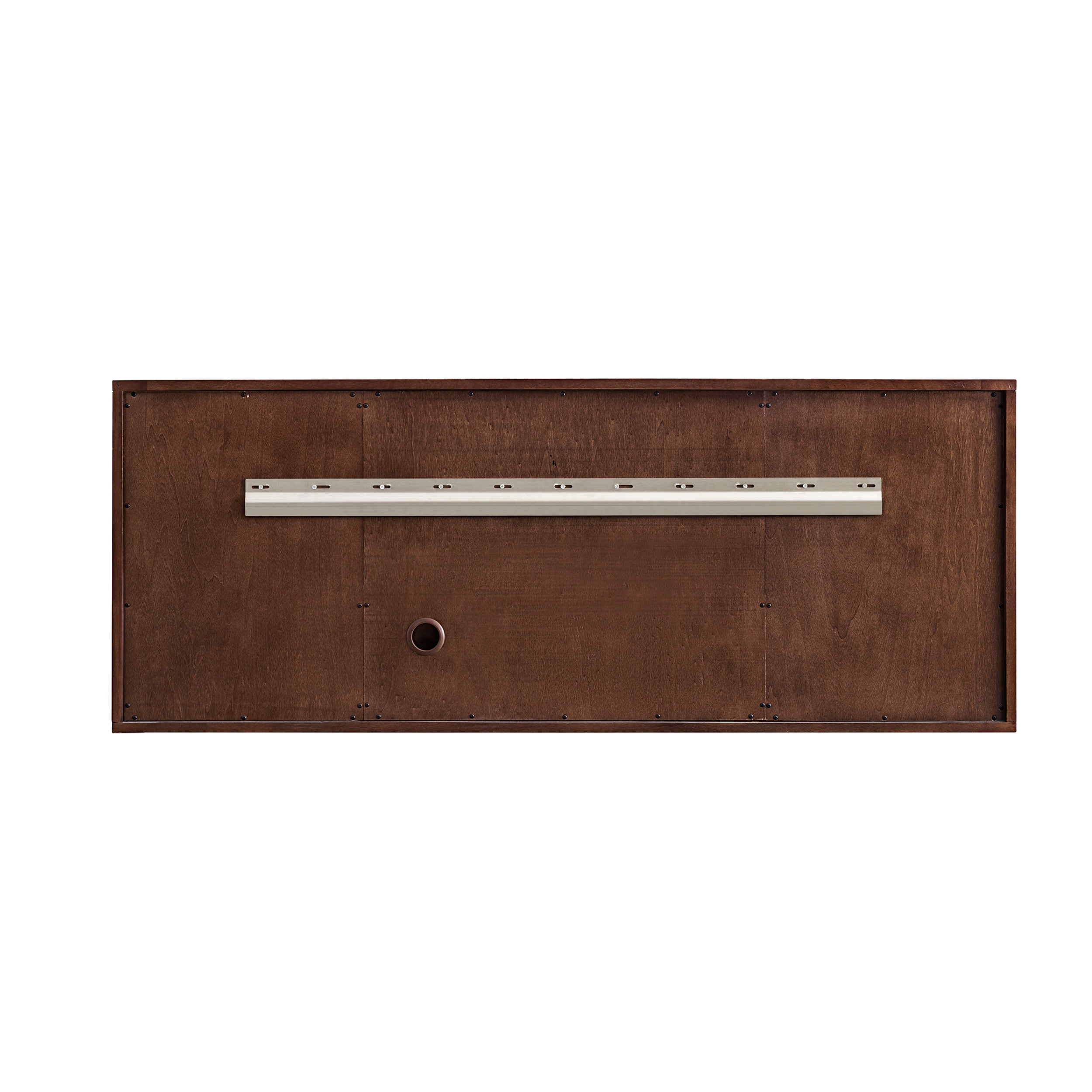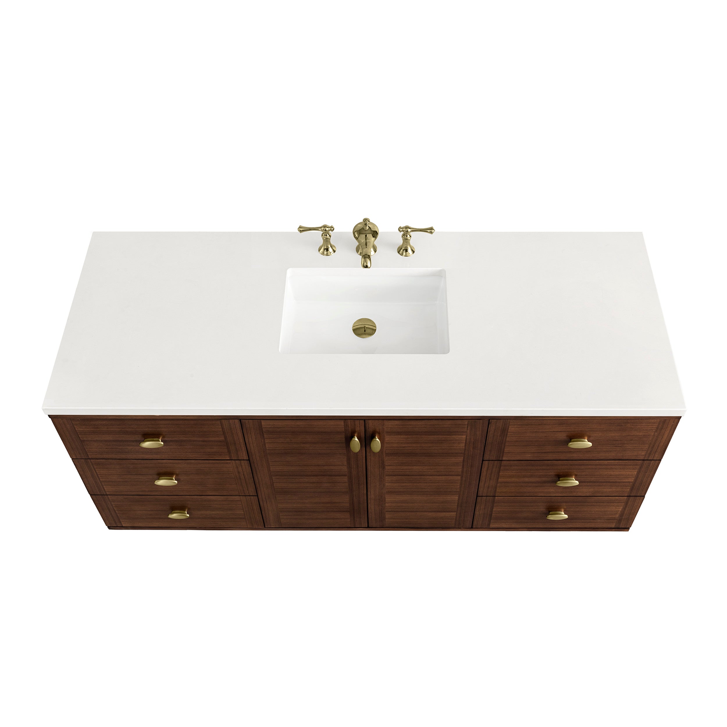 The 60" Amberly Single Vanity celebrates Mid-Century simplistic forms and finish details combined with practical function. The beauty of the natural grains in the walnut veneer steals the show, while the decorative, oval knobs in Champagne Brass provide the perfect accent. This two door the cabinet opens to a spacious interior with a single shelf and a convenient USB/Electric power outlet. Six drawers provide ample storage and include one removable bamboo organizer. The elegant wood base elevates the Vanity Cabinet in a true console style, though you may choose the more modern, space-saving wall-mount option.