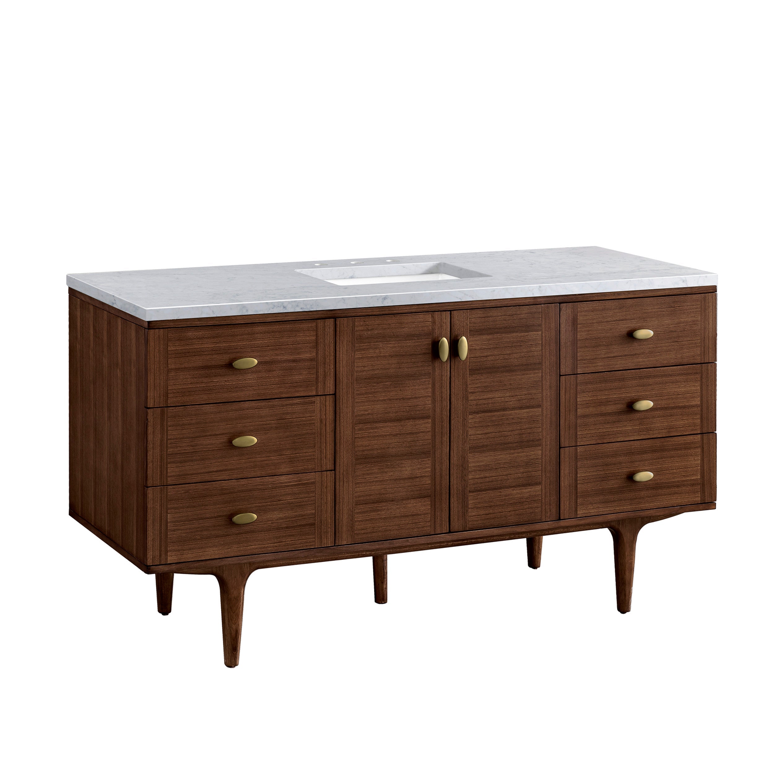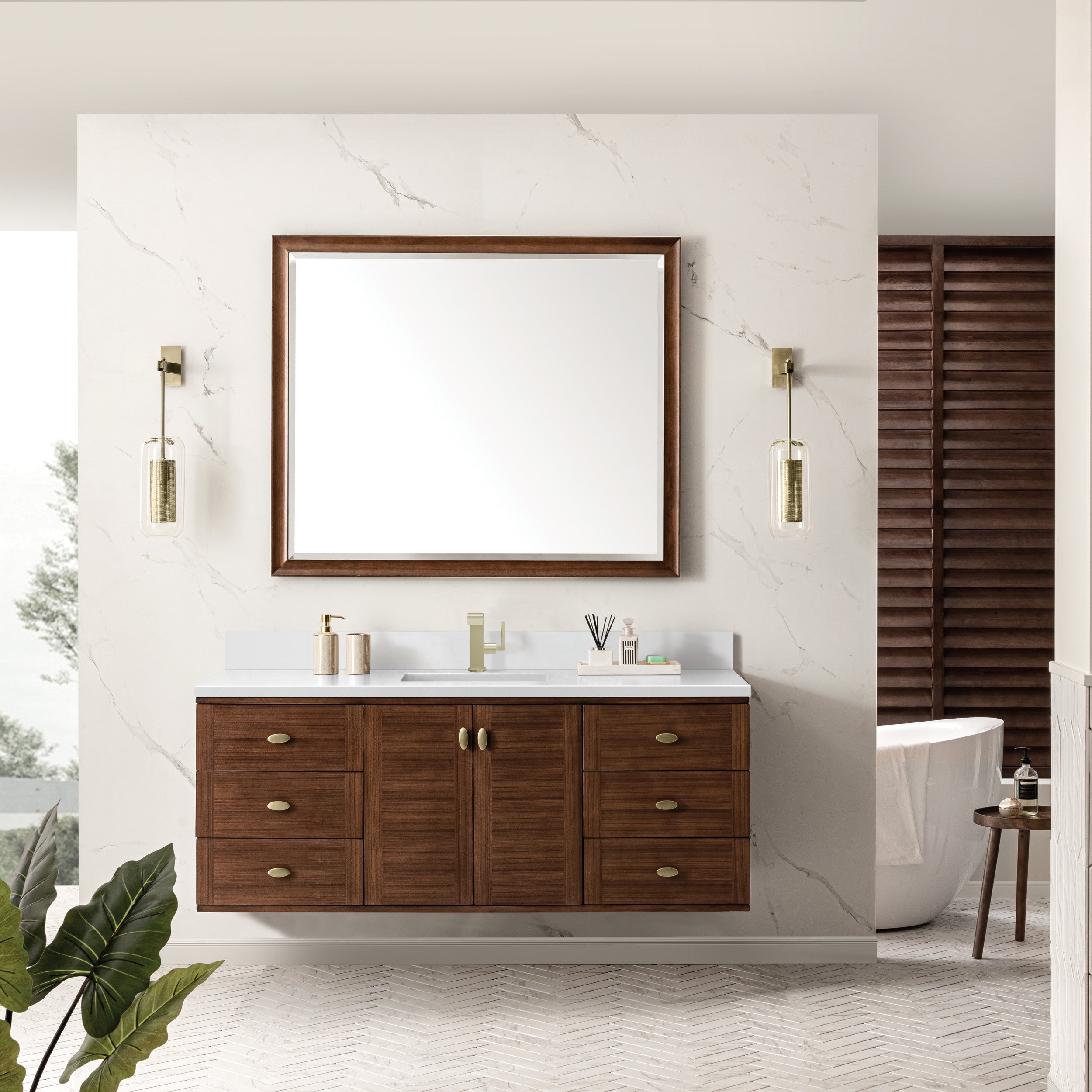The Mid-Century Modern inspired Amberly collection showcases a rich walnut wood cabinet, set elegantly atop subtly curved legs, and accented with oval Champagne Brass pulls. Floating or freestanding, Amberly is an eye-catching focal point for any luxury bathroom decor.
