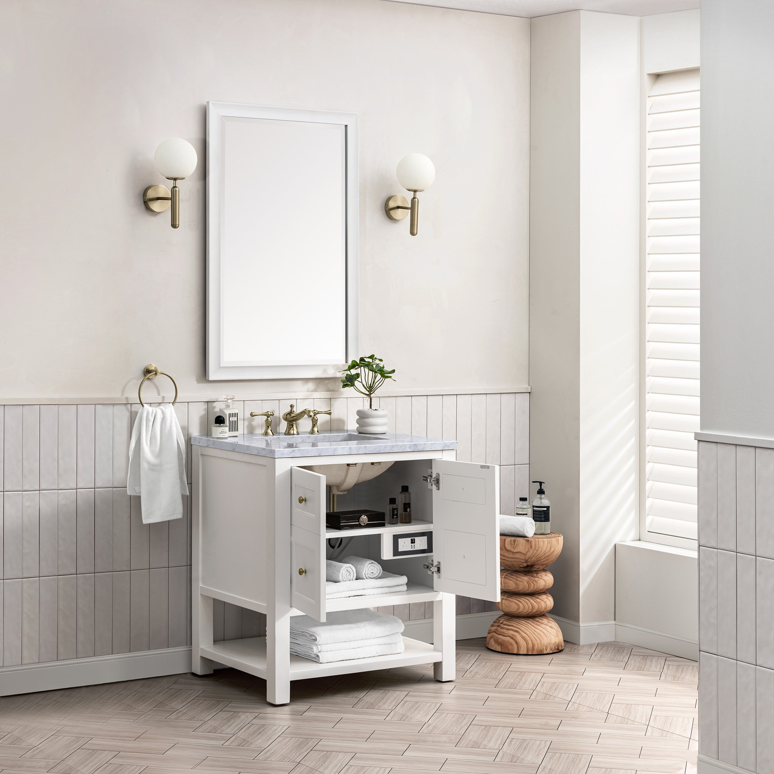 The beautiful Breckenridge Vanity 30" Single Vanity in Bright White features round Champagne Brass knobs that perfectly complement the clean look of this cabinet. The faux-drawer style doors open to an interior shelf with convenient built-in USB/electric outlets. The lower shelf with extra storage for towels and decor completes the cabinet.