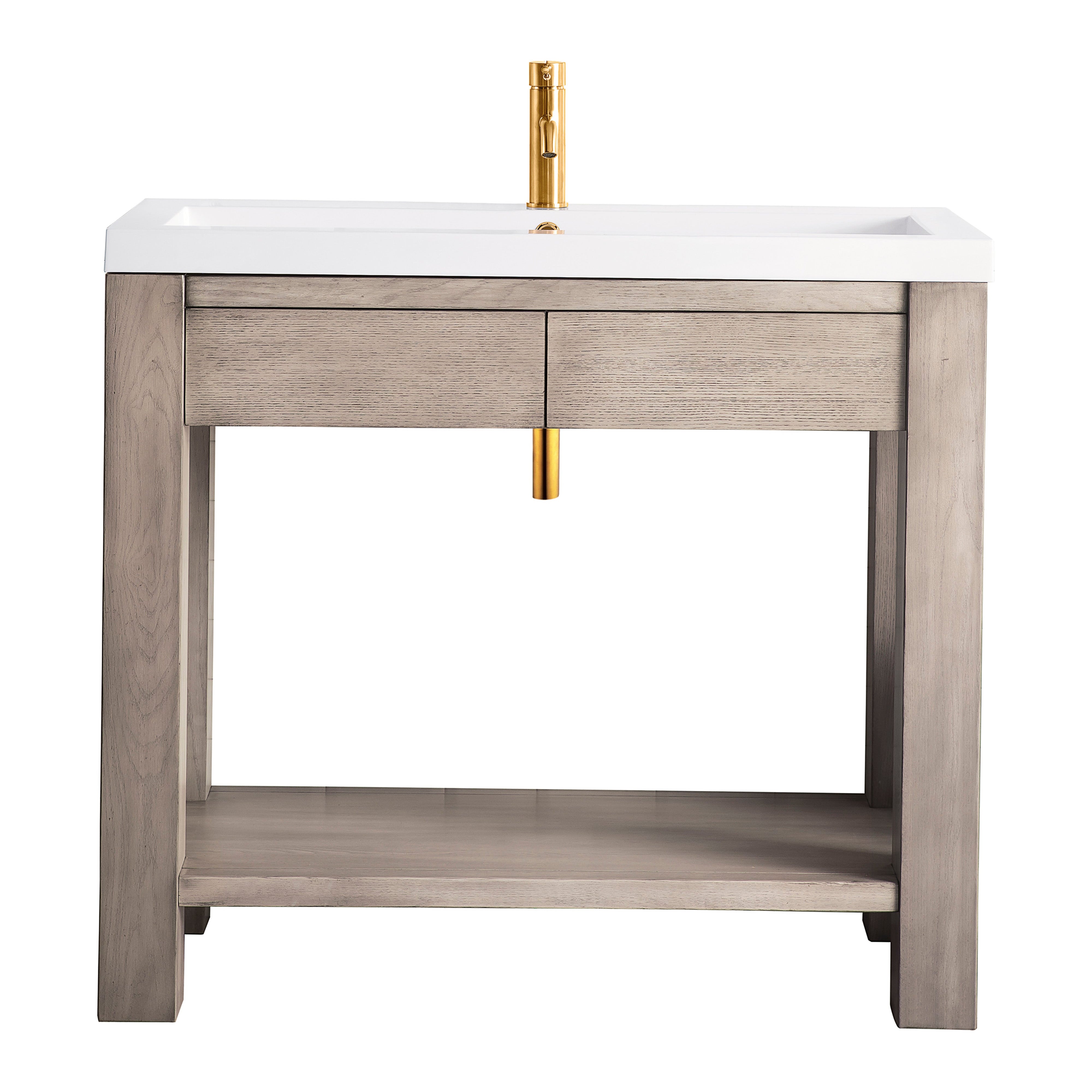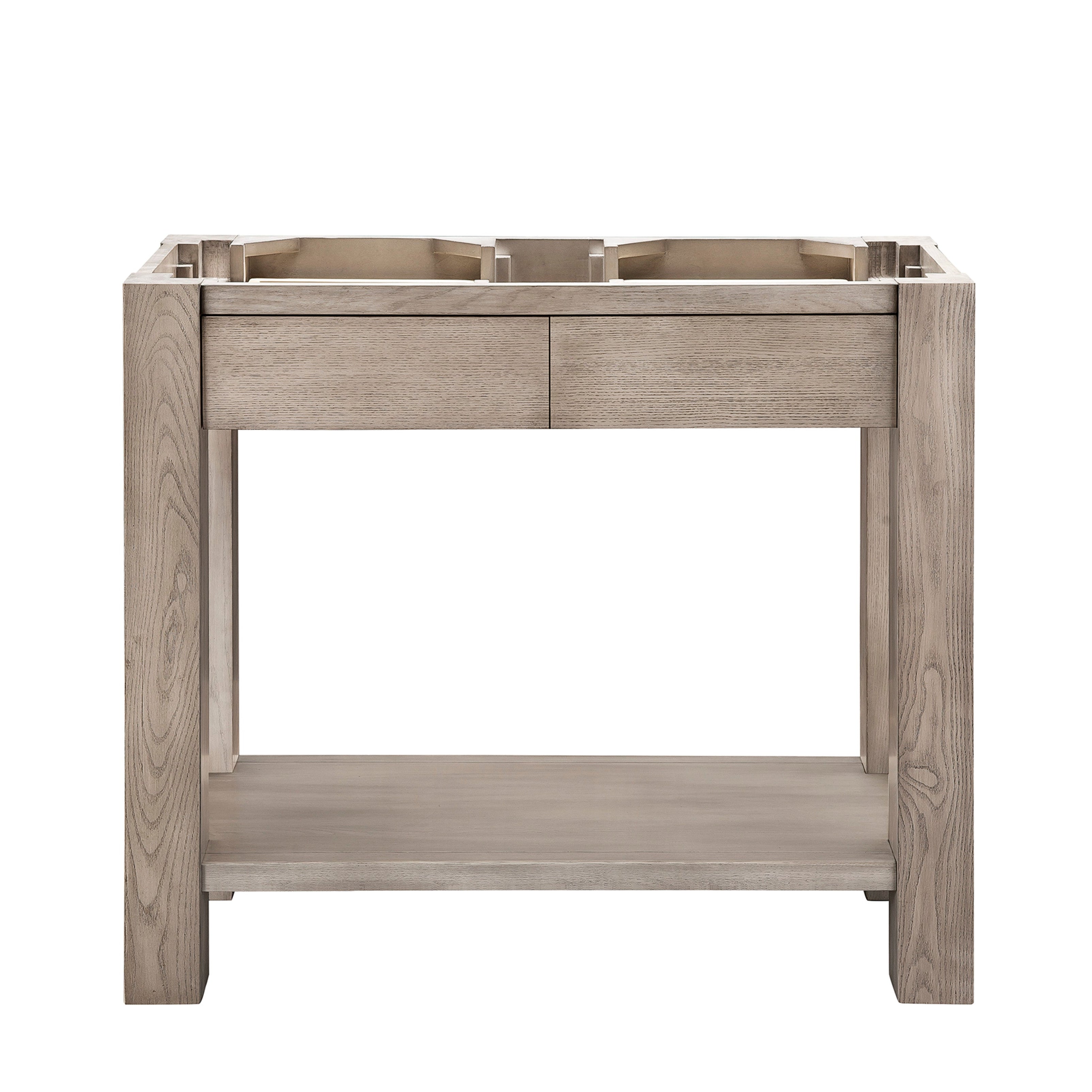 The Brooklyn console by James Martin Vanities combines rustic charm with industrial modern style to add a unique touch to any bathroom. Defined by its robust frame, the Brooklyn is a versatile console that works beautifully with a wide variety of decor styles. Compact in size, this piece is ideal for small bathrooms while still offering elegant and practical storage. Featuring smooth operating drawers and an open lower shelf, it provides convenient space for toiletries and everyday essentials. The naturally minimal design pairs a wooden base with a wide integrated solid surface top and sink, built to remain durable and timeless.