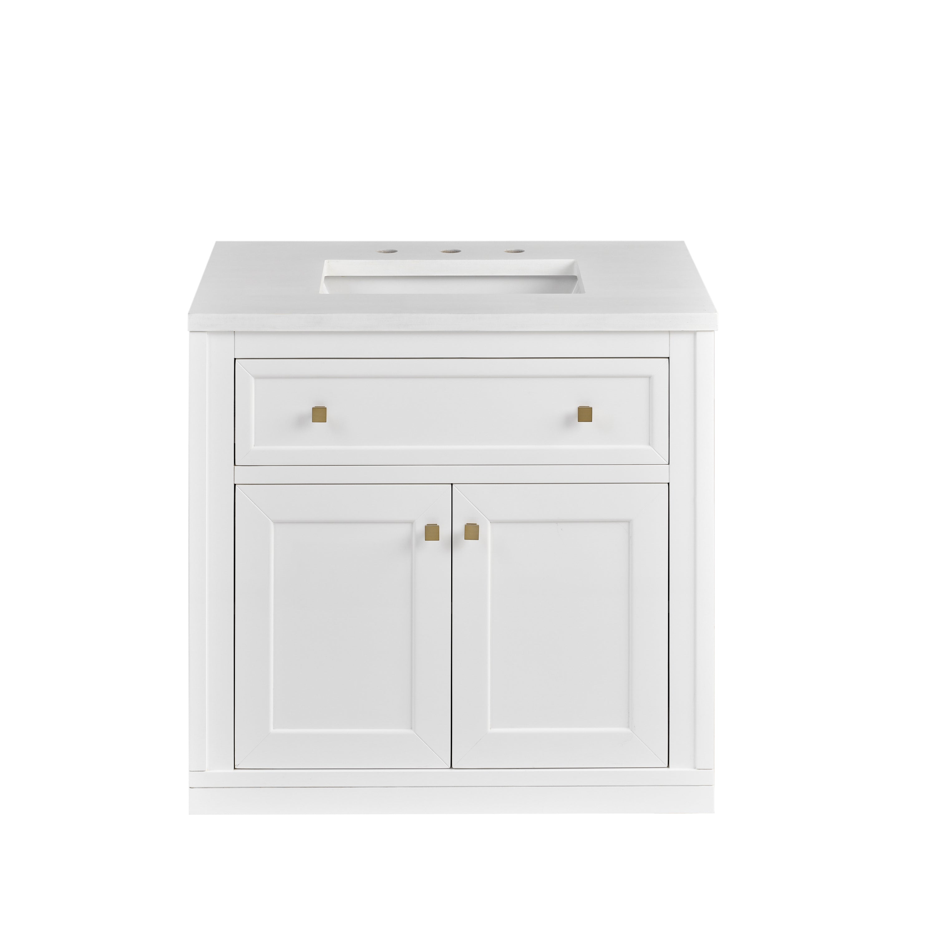 The sophisticated details and clean lines of the Chicago 30" Single Vanity by James Martin Vanities make it the perfect choice for any bathroom. Featuring a Glossy White finish, this vanity offers ample storage with its two-door cabinet, adjustable interior shelf, and top-row tip-out drawer. Champagne Brass knobs and legs add a contemporary touch; or choose to forego the metal legs for a modern wall-mounted installation. The addition of a stunning Parisien Bleu Silestone top with undermount sink completes the look.