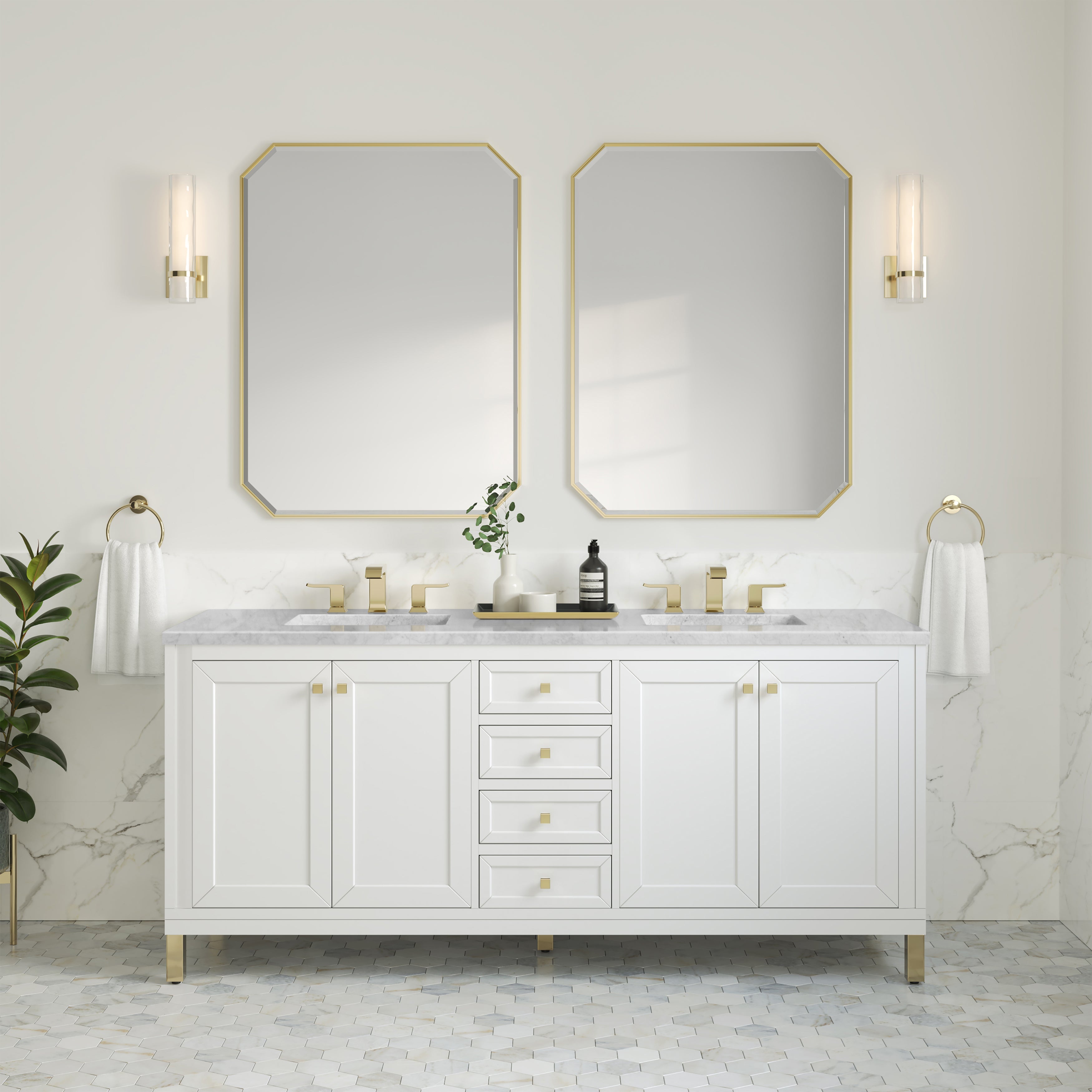 - Glossy white finish paired with champagne brass hardware