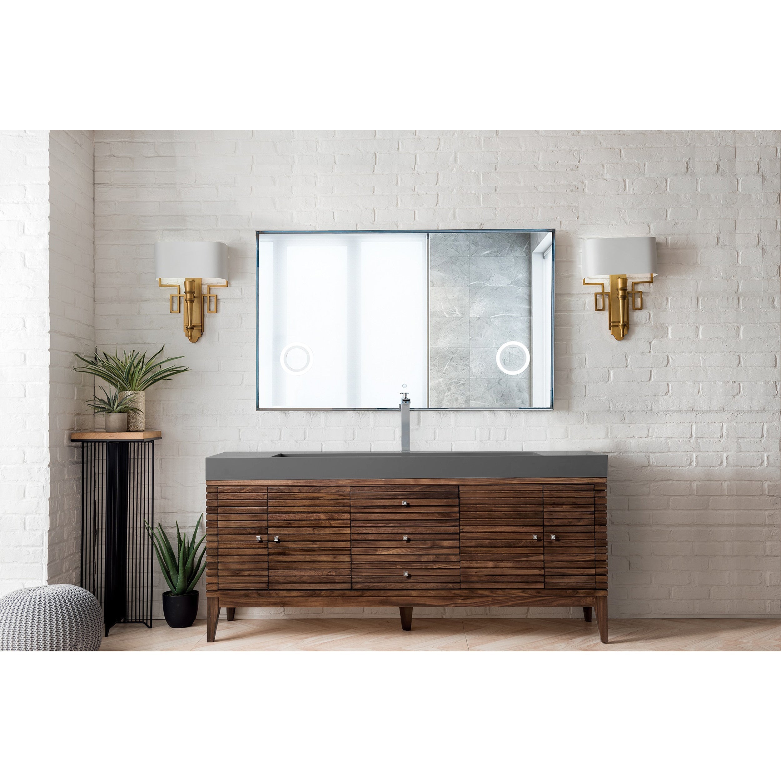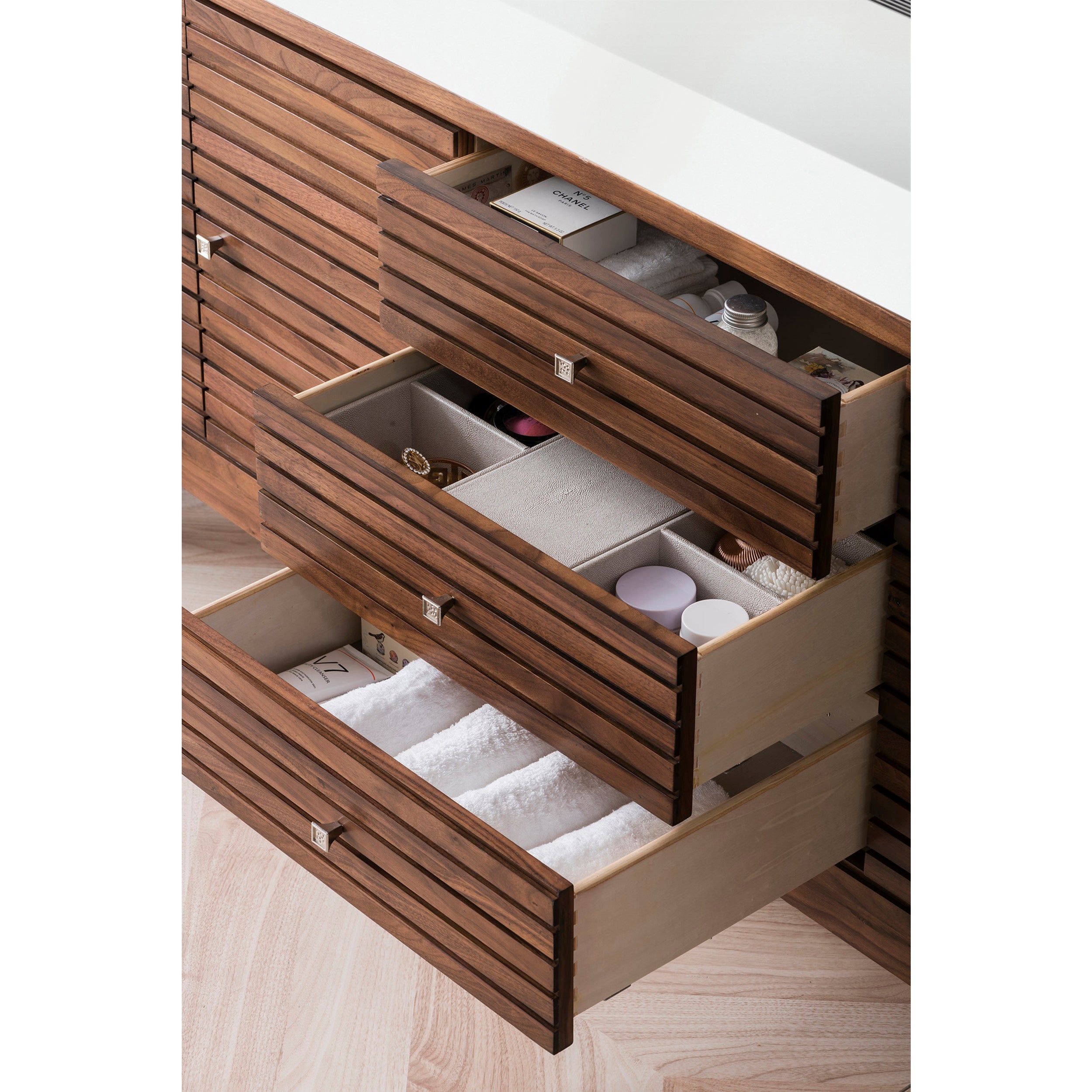 The Linear 210 series has three cabinet widths: 36" 59" and 72" The wider cabinets: 59" and 72" features a component with electrical and USB outlets and a faux shagreen drawer organizer. Cabinets are constructed with premium hardwood plywood cores with solid wood braces and brackets. The Glossy White cabinet exterior is made from solid Birch and Poplar, while exteriors of both walnut color finishes (WLT and WWW) are crafted from solid American Walnut. The 210 series also features custom sized composite countertops with integrated basins.