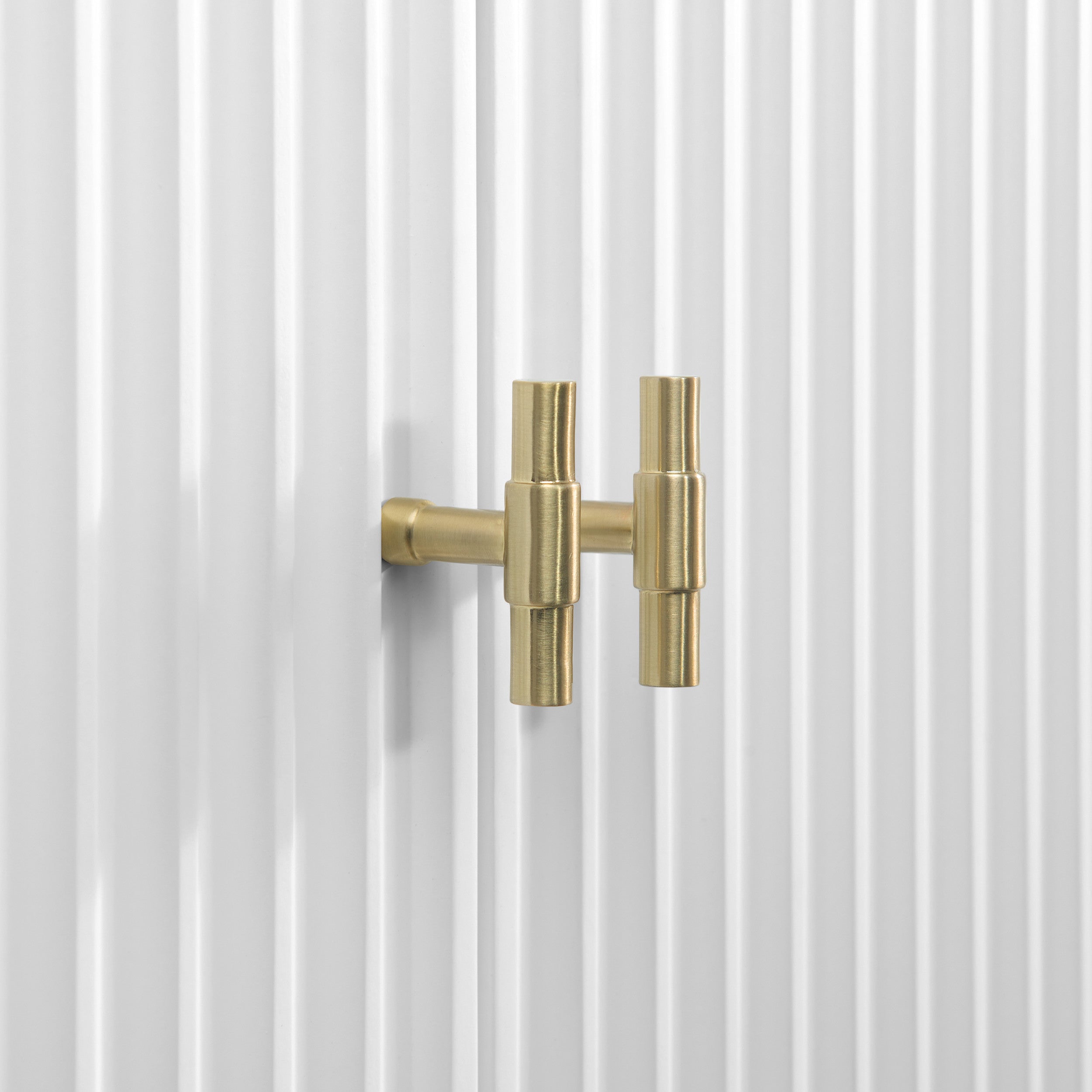 The deeply fluted panels of the Myrrin collection, framed in a sleek, minimalistic silhouette, bring an harmonious blend of classical elegance and contemporary design. The geometric play on the contrasting panels not only adds visual interest but also opens to reveal ample storage and organization. Offered in 4 sizes and 3 choices of finishes, each is complemented by Champagne Brass toggle-style knobs for a luxurious finishing touch.