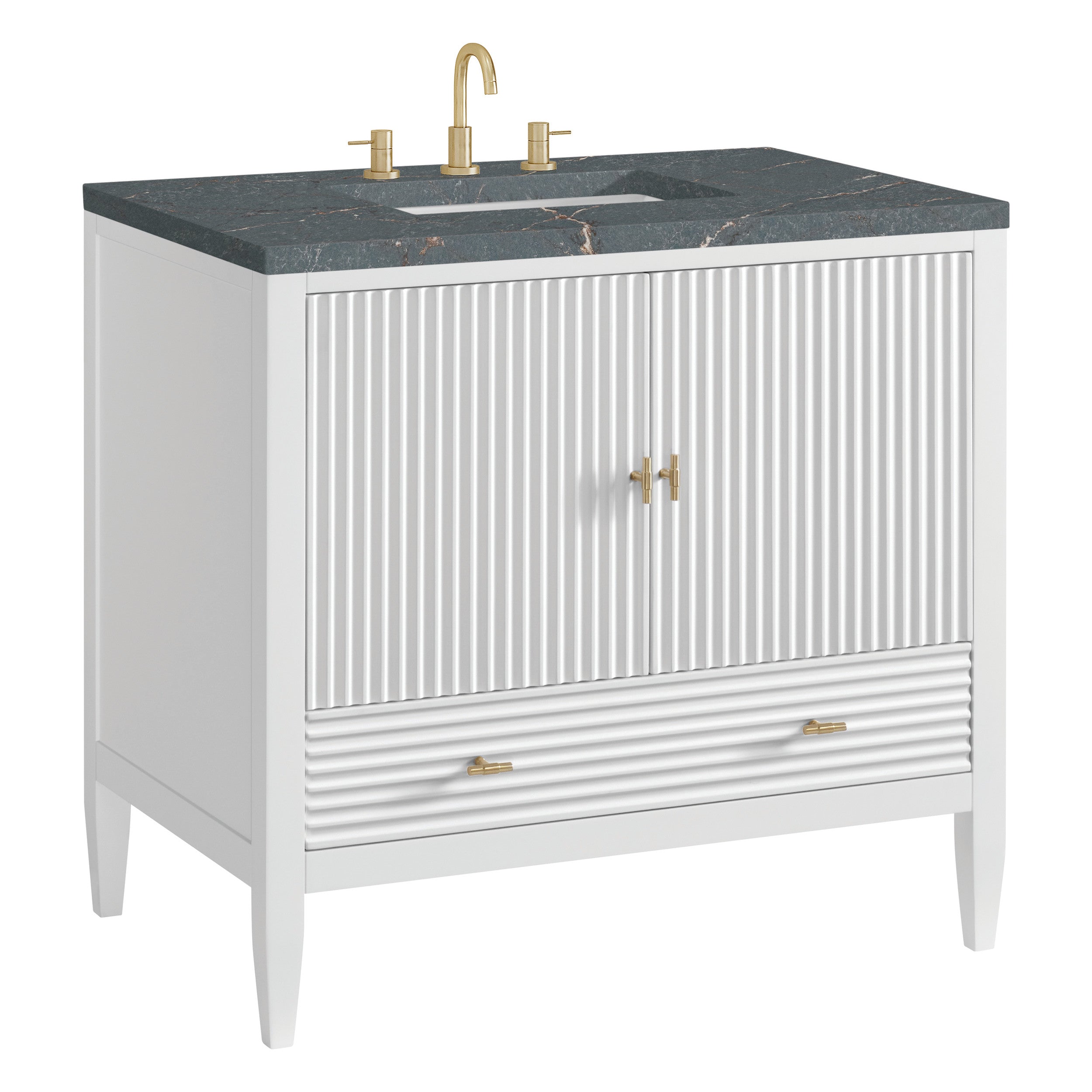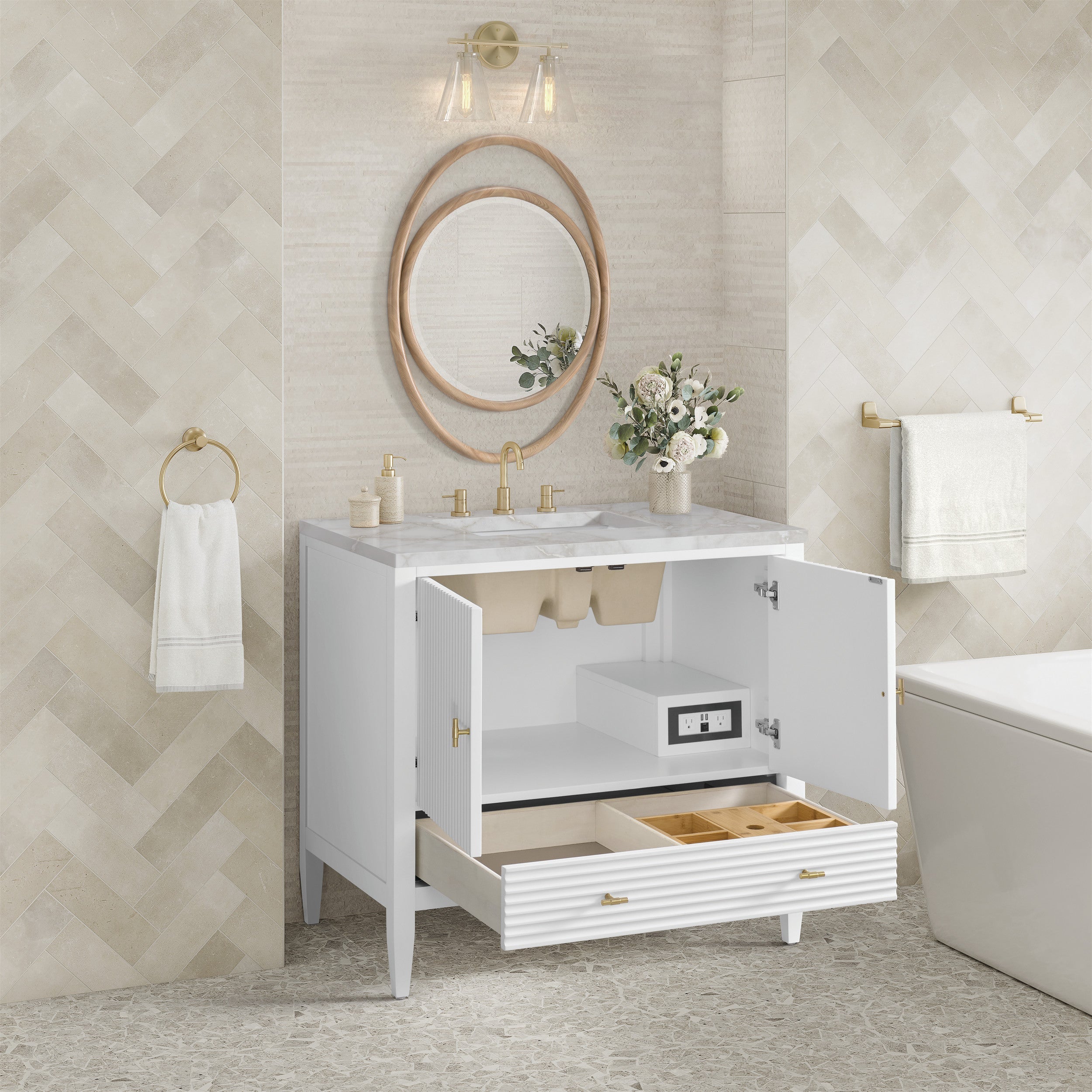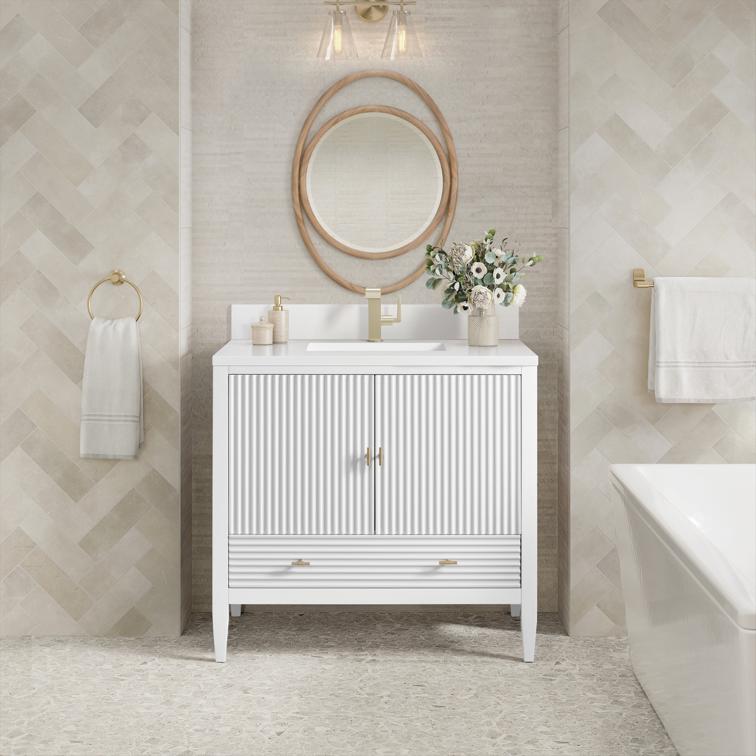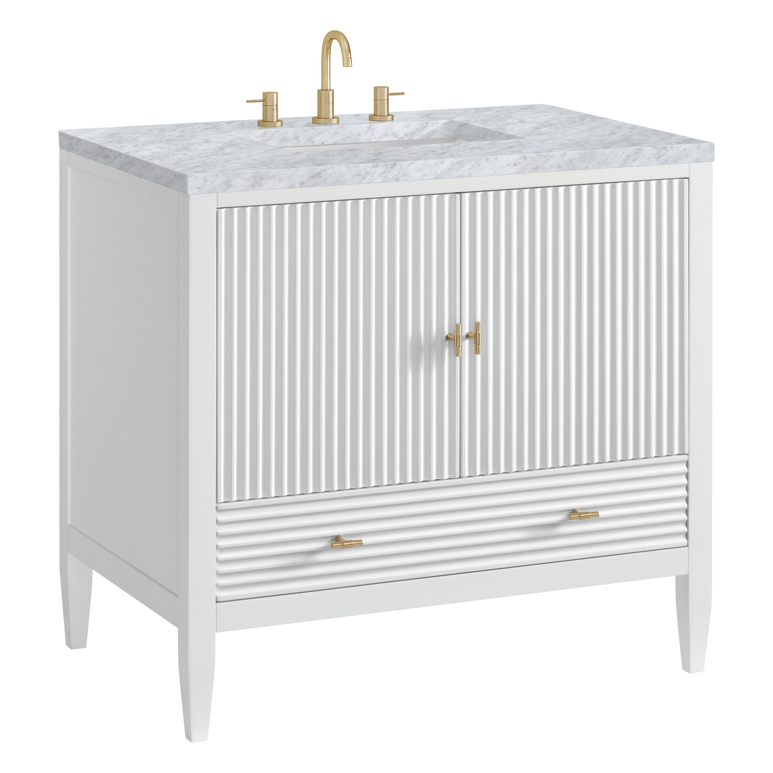 The 36" Myrrin Single Vanity features a minimalistic silhouette with fluted details, resulting in a blend of classical elegance and contemporary design. The deeply fluted panels run perpendicular on the doors and drawers, adding sophistication and visual interest to the design. Toggle-style knobs in Champagne Brass provide a luxe accent to the rich Bright White finish. The two-door cabinet opens to a spacious interior with a single shelf and a convenient USB/Electric power outlet. A single, lower-level drawer lends additional storage. Choose one of our tops with undermount, rectangular sinks to perfectly complete this masterpiece.