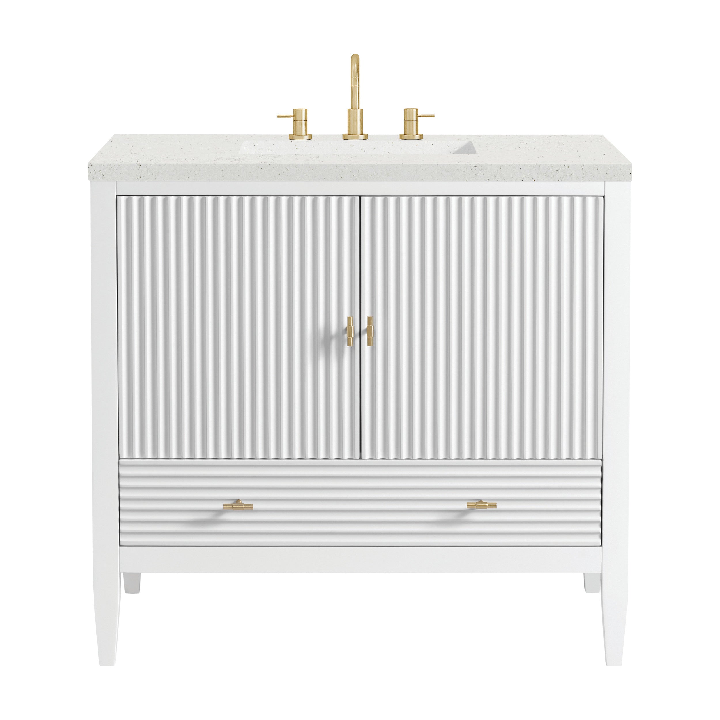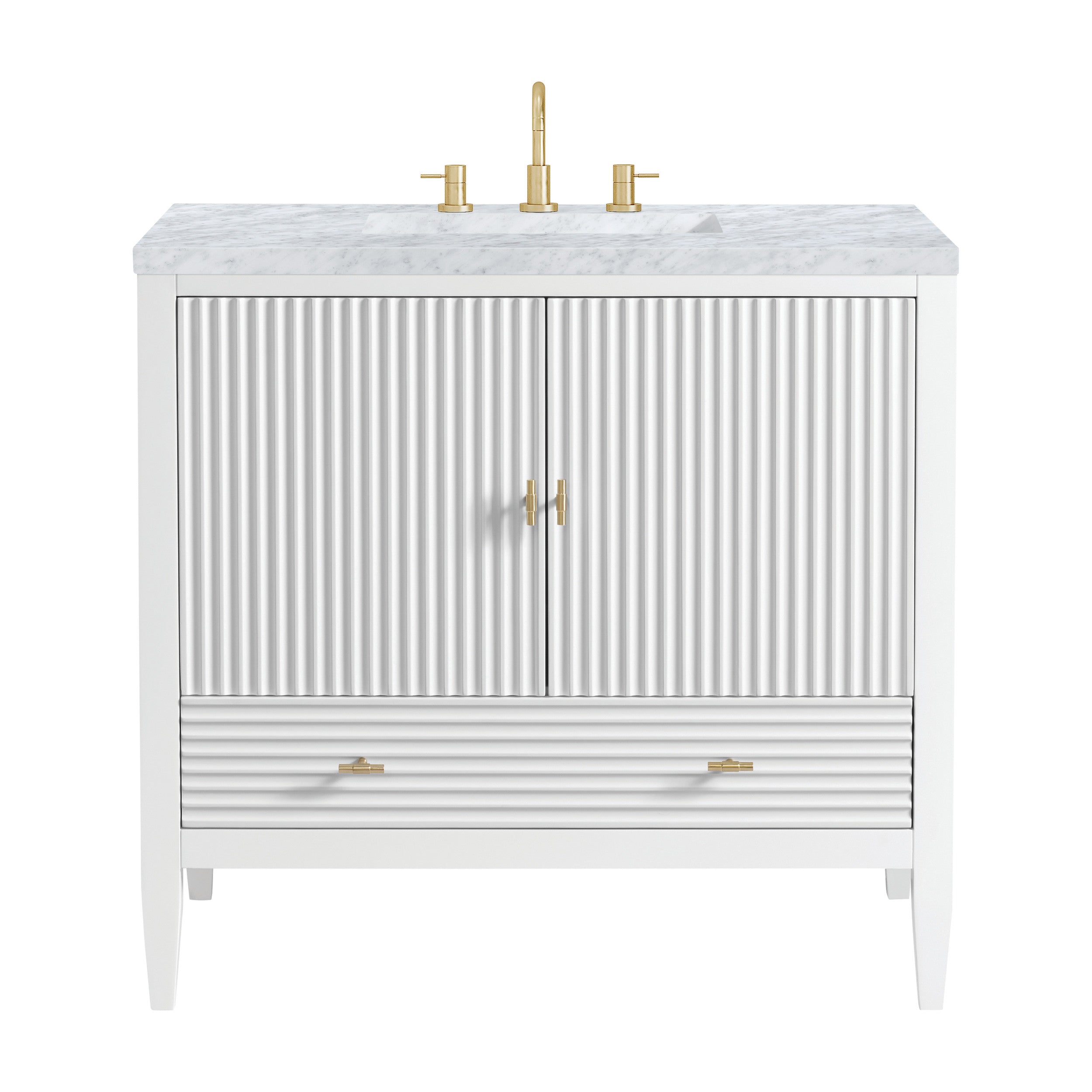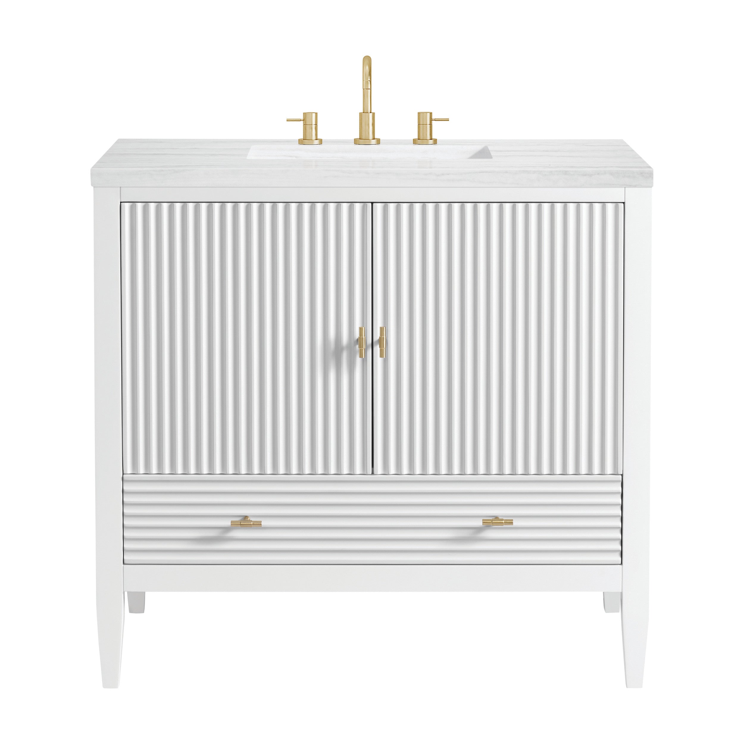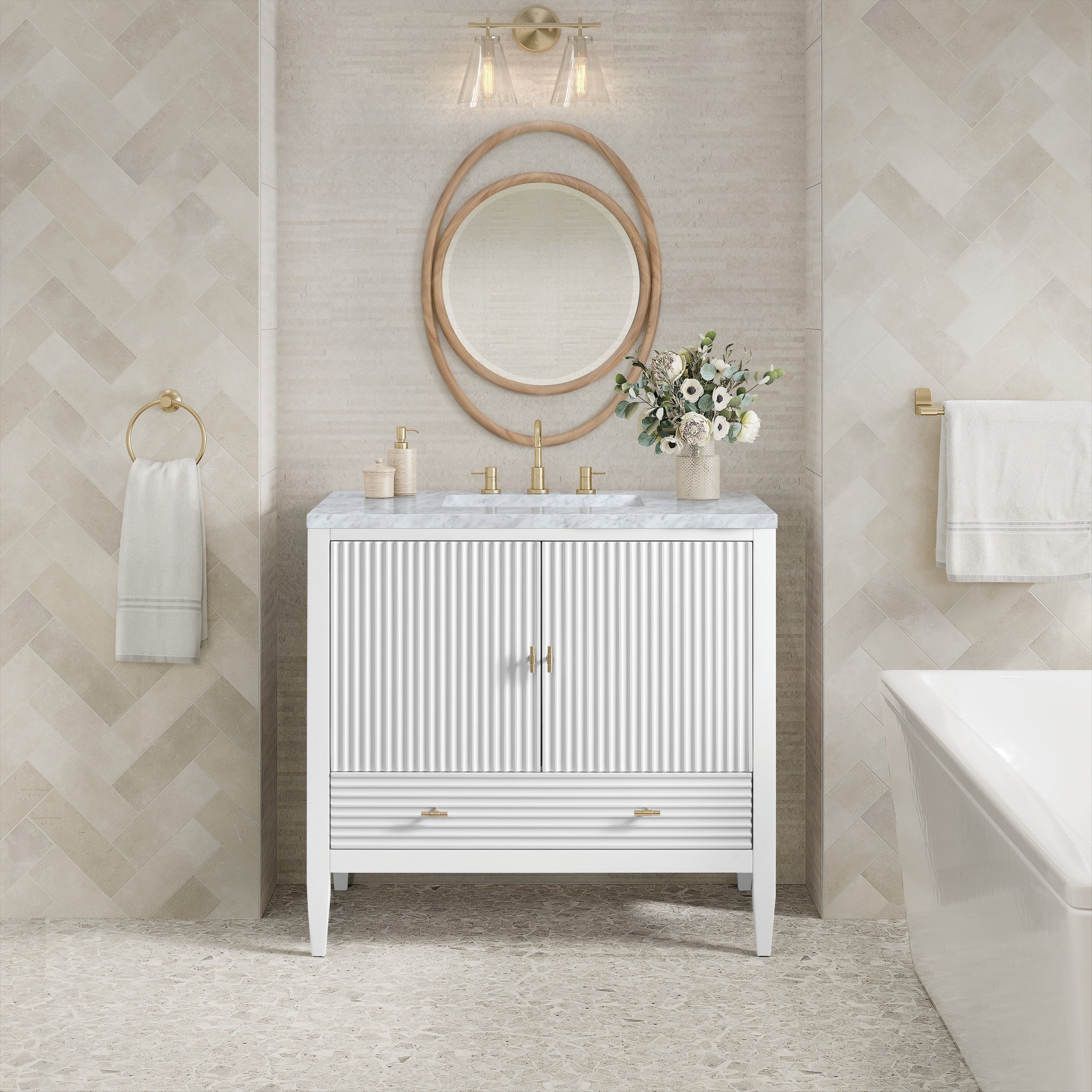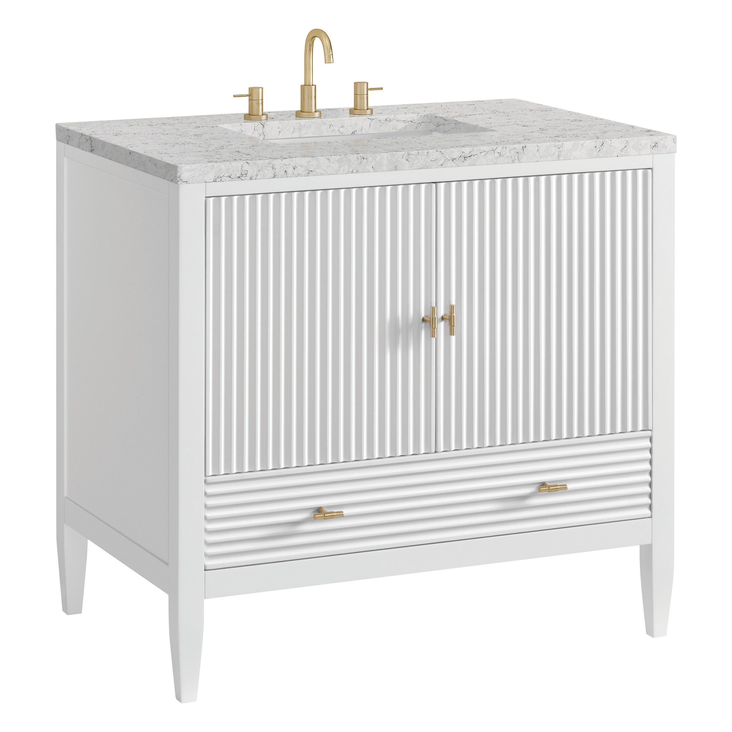 The 36" Myrrin Single Vanity features a minimalistic silhouette with fluted details, resulting in a blend of classical elegance and contemporary design. The deeply fluted panels run perpendicular on the doors and drawers, adding sophistication and visual interest to the design. Toggle-style knobs in Champagne Brass provide a luxe accent to the rich Bright White finish. The two-door cabinet opens to a spacious interior with a single shelf and a convenient USB/Electric power outlet. A single, lower-level drawer lends additional storage. Choose one of our tops with undermount, rectangular sinks to perfectly complete this masterpiece.