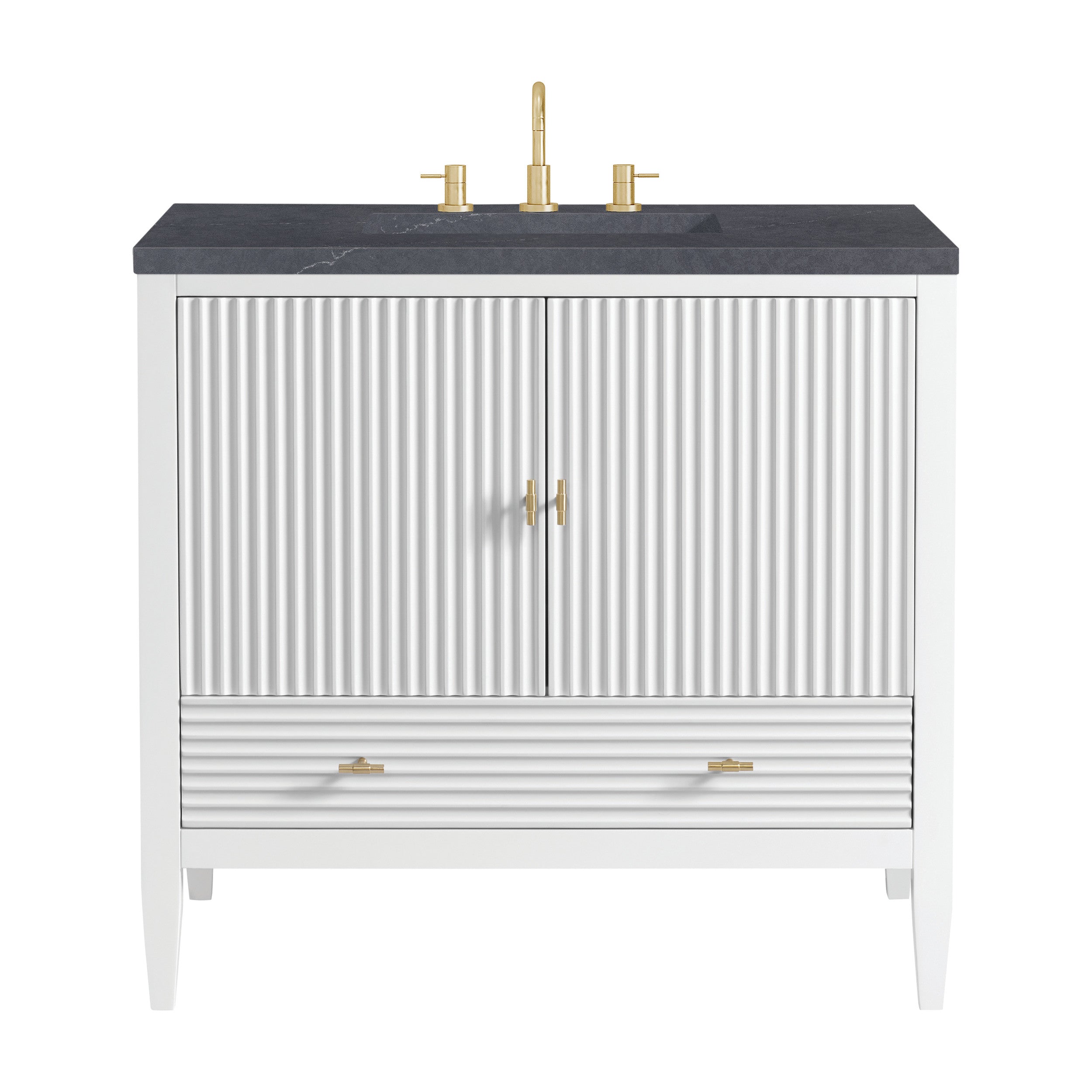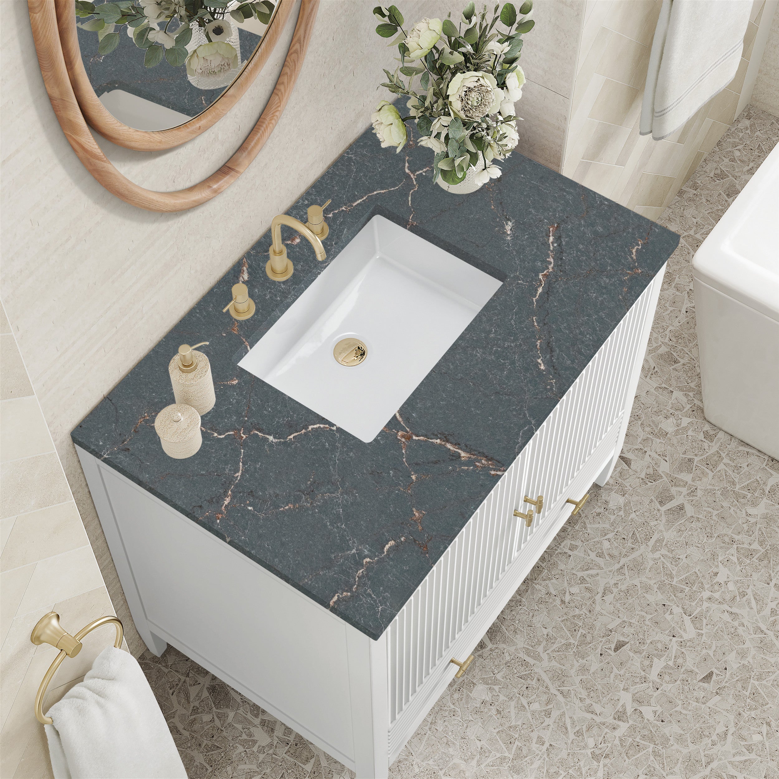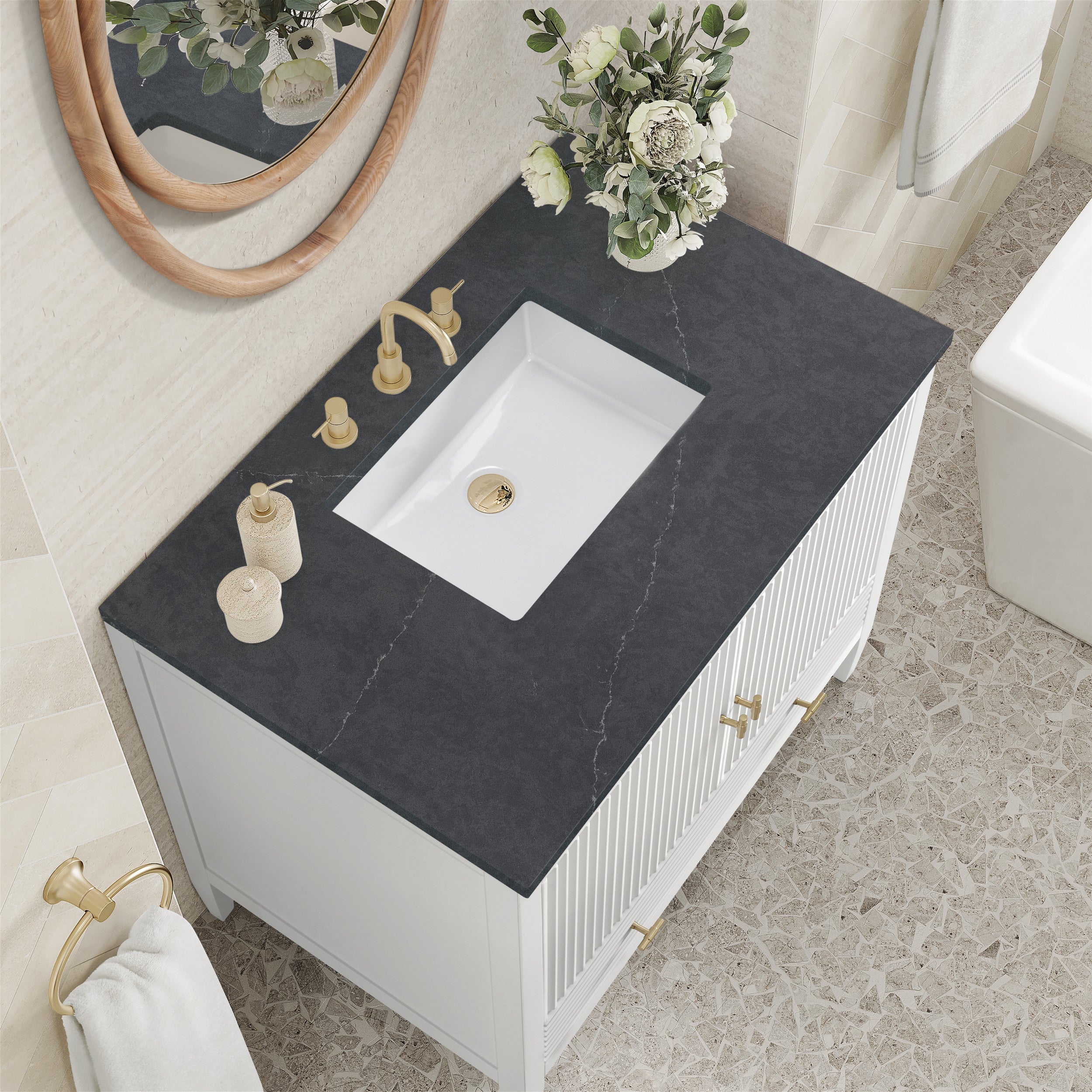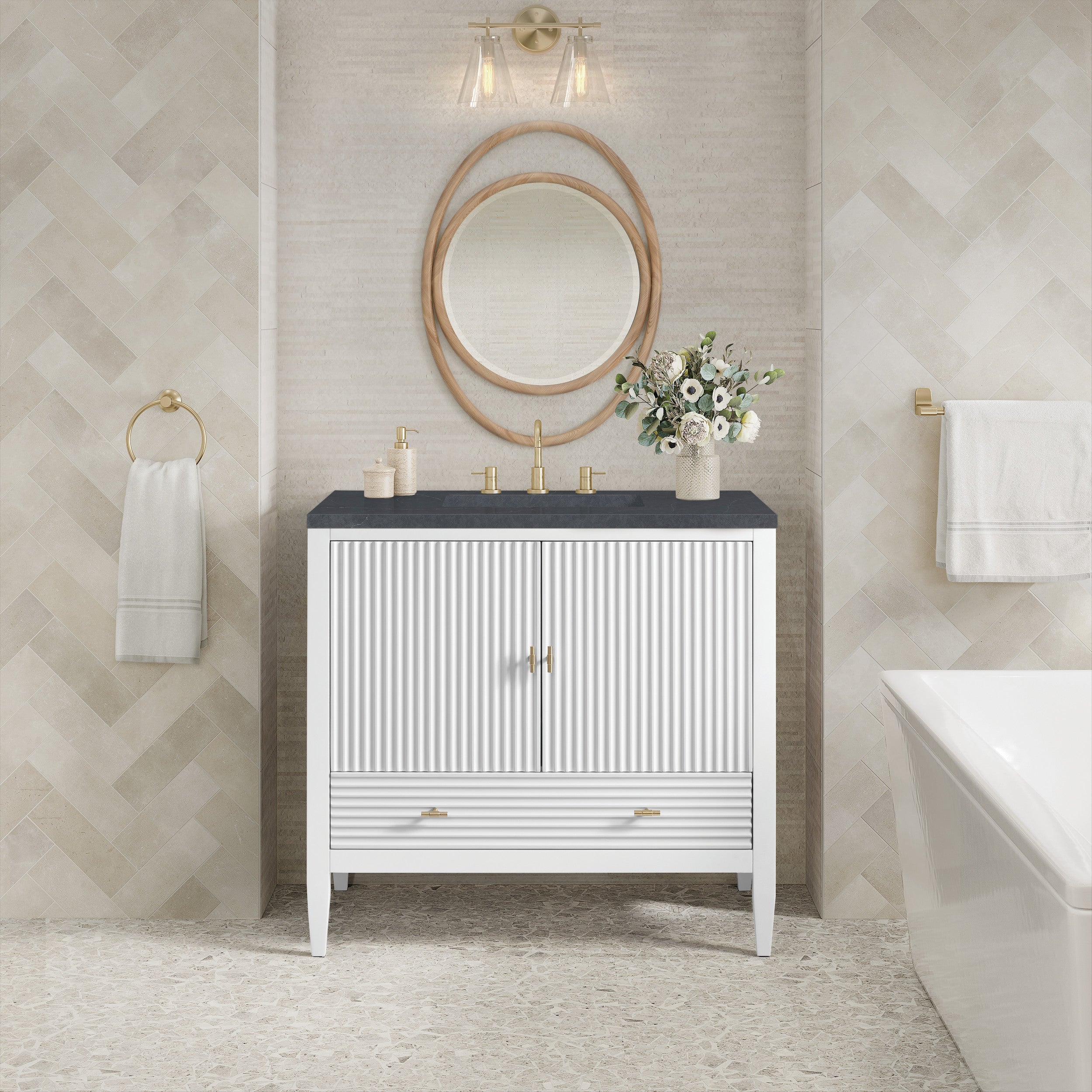 The 36" Myrrin Single Vanity features a minimalistic silhouette with fluted details, resulting in a blend of classical elegance and contemporary design. The deeply fluted panels run perpendicular on the doors and drawers, adding sophistication and visual interest to the design. Toggle-style knobs in Champagne Brass provide a luxe accent to the rich Bright White finish. The two-door cabinet opens to a spacious interior with a single shelf and a convenient USB/Electric power outlet. A single, lower-level drawer lends additional storage. Choose one of our tops with undermount, rectangular sinks to perfectly complete this masterpiece.