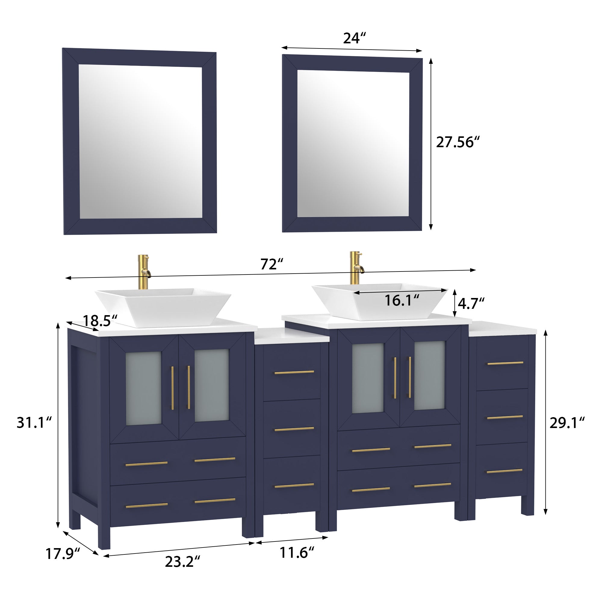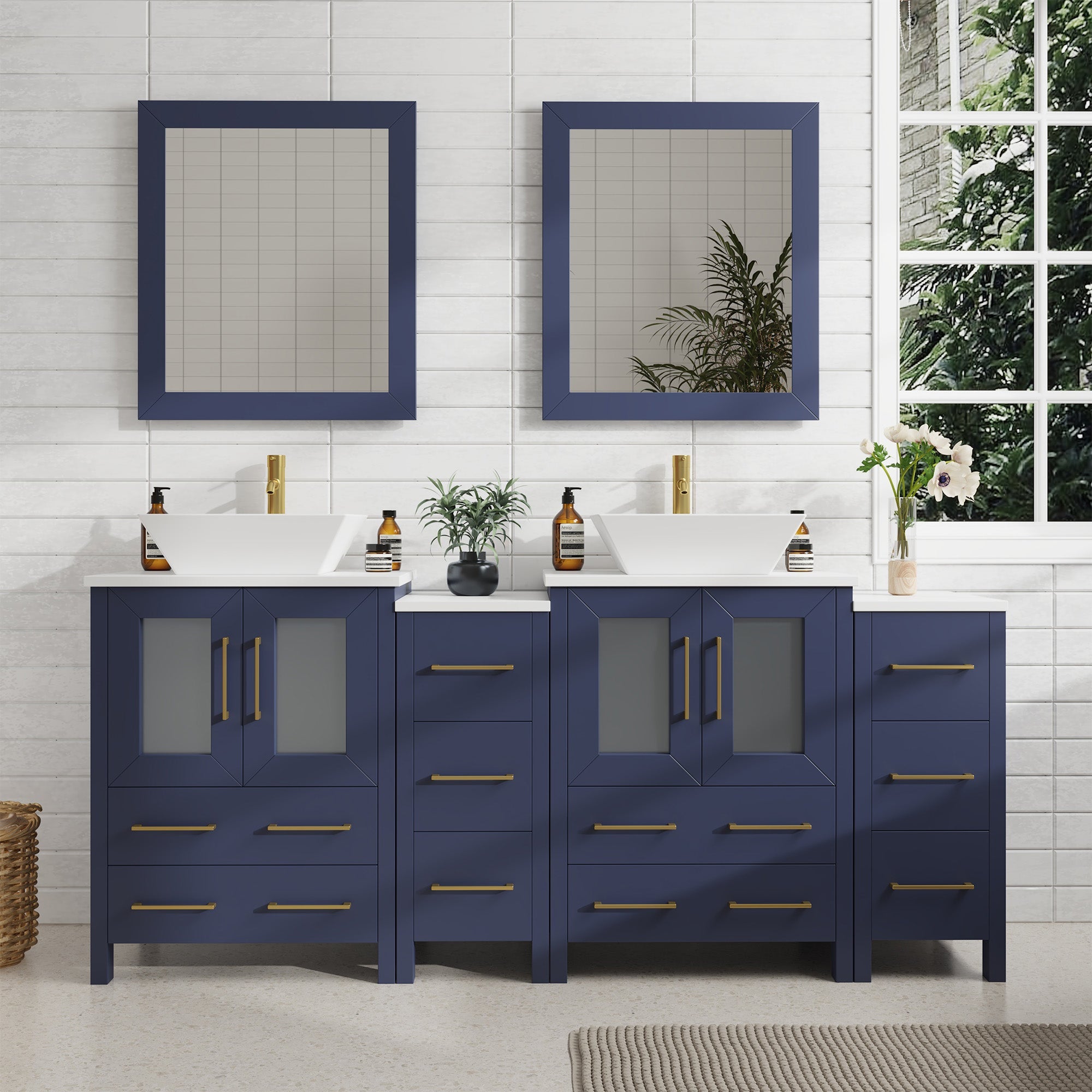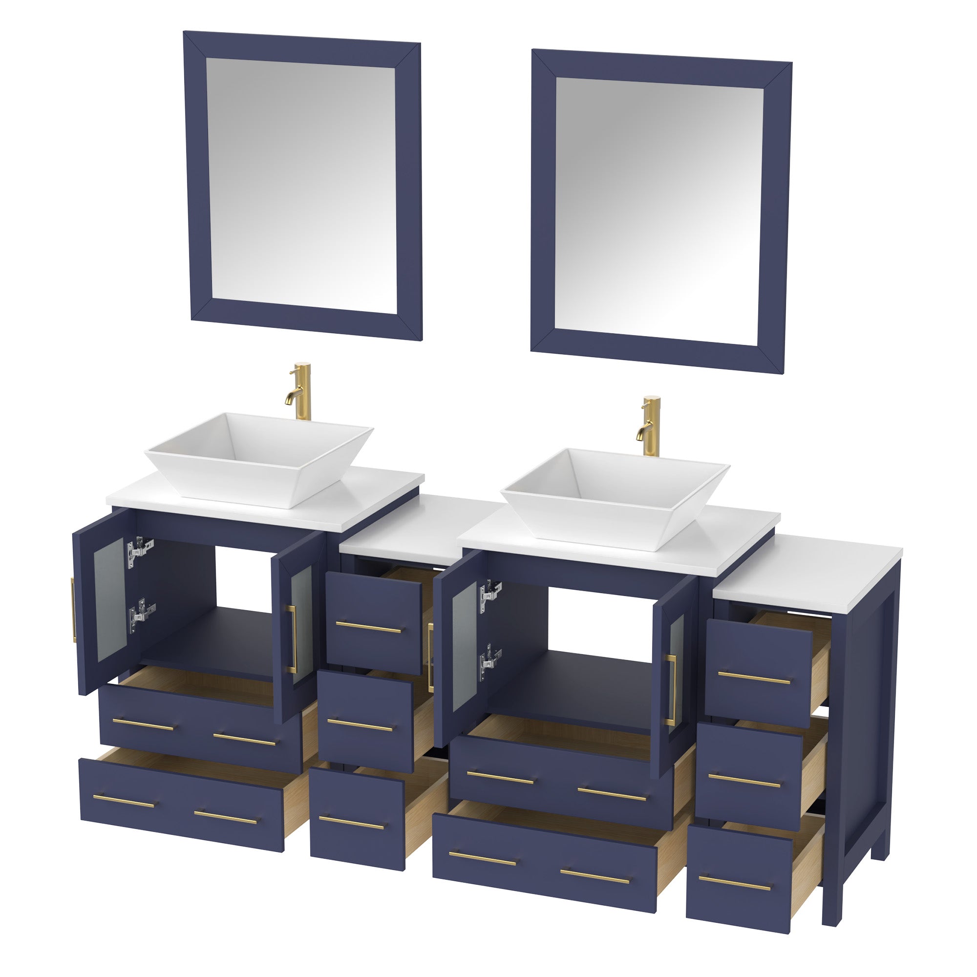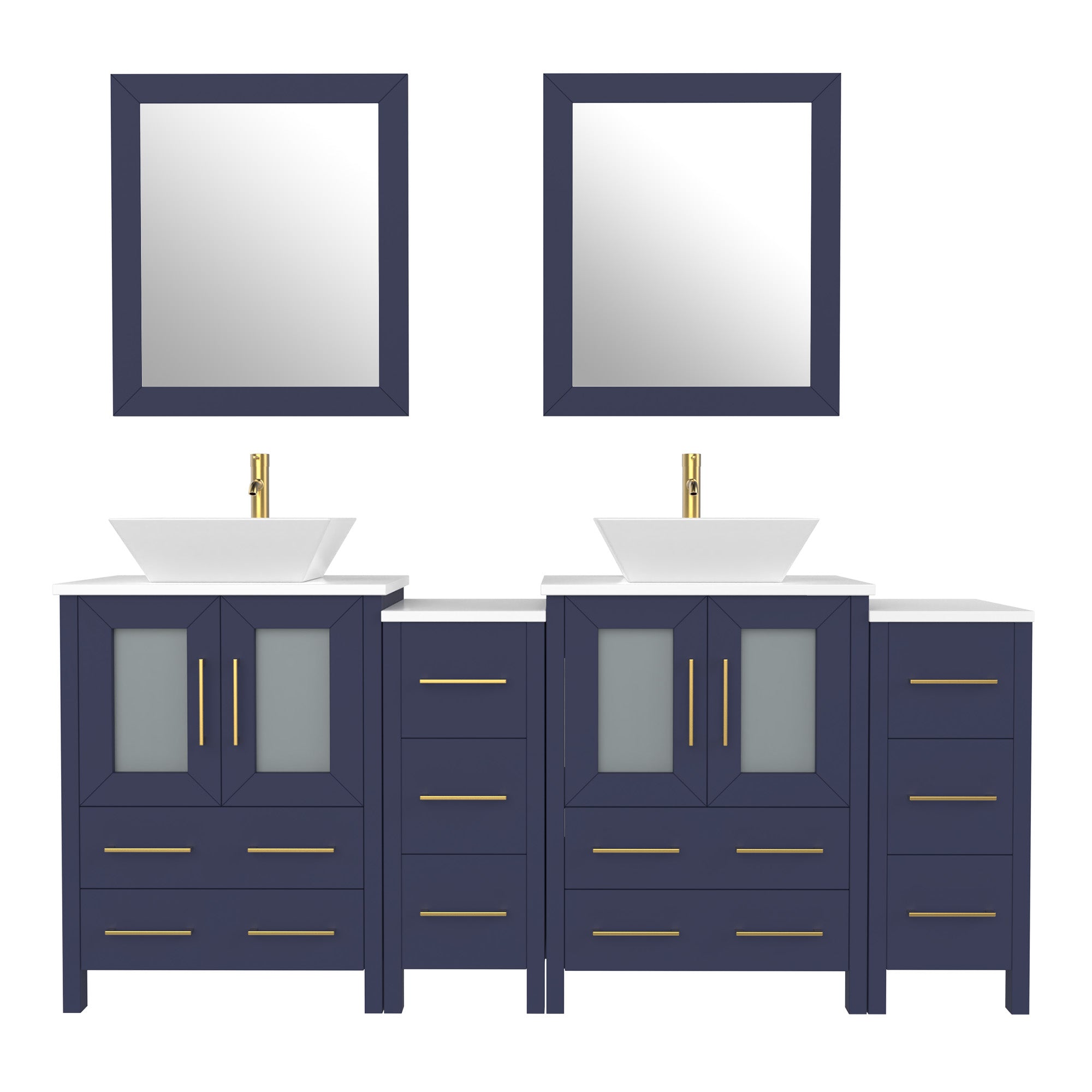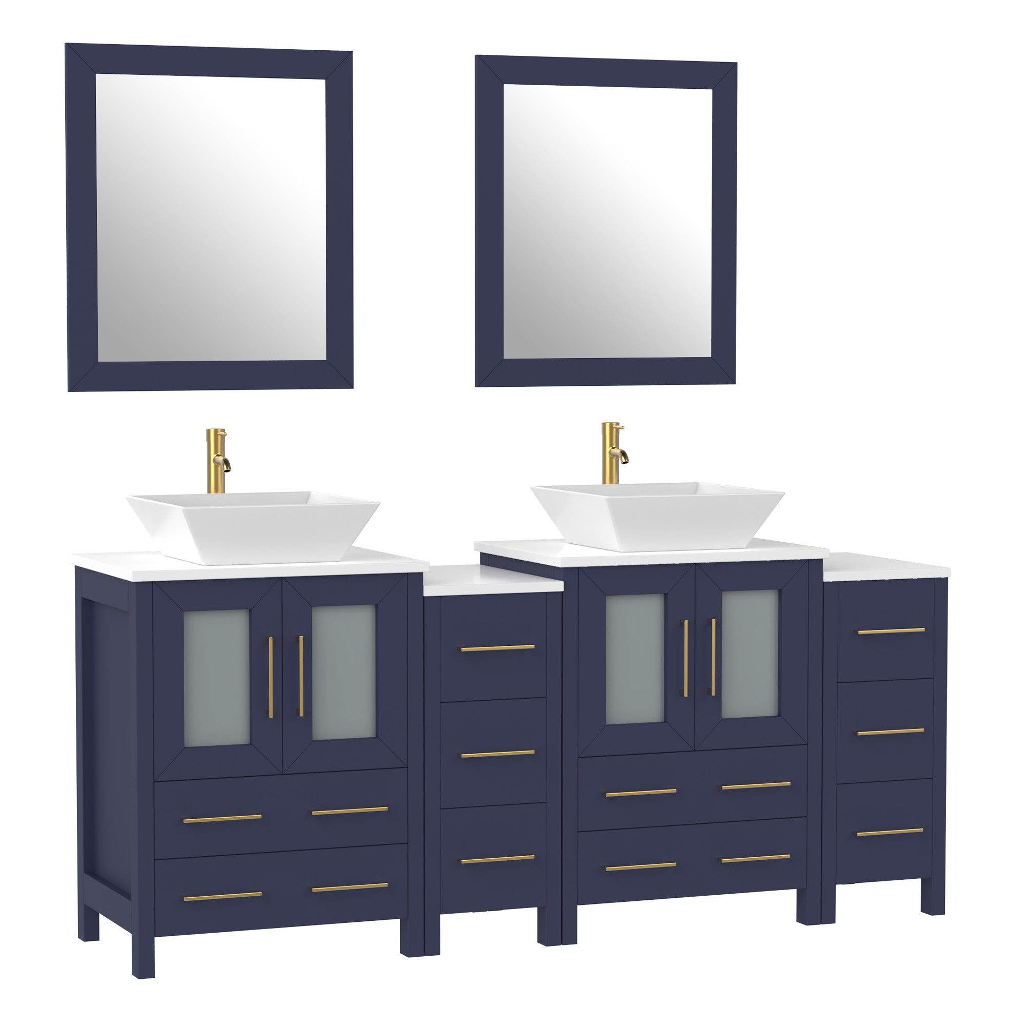 Vanity Art Monaco 72" Double Vessel Sink Bathroom Vanity Set with Sinks and Mirrors (Engineered Marble Top) - 2 Side Cabinets