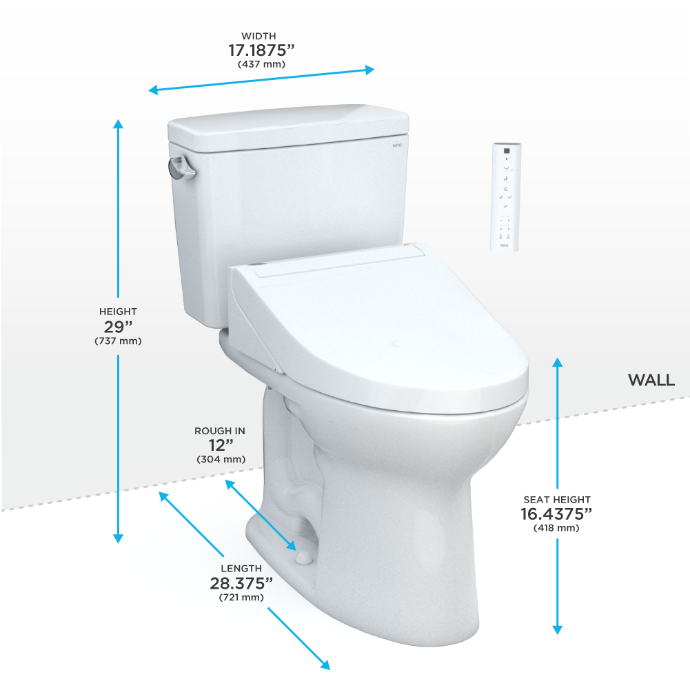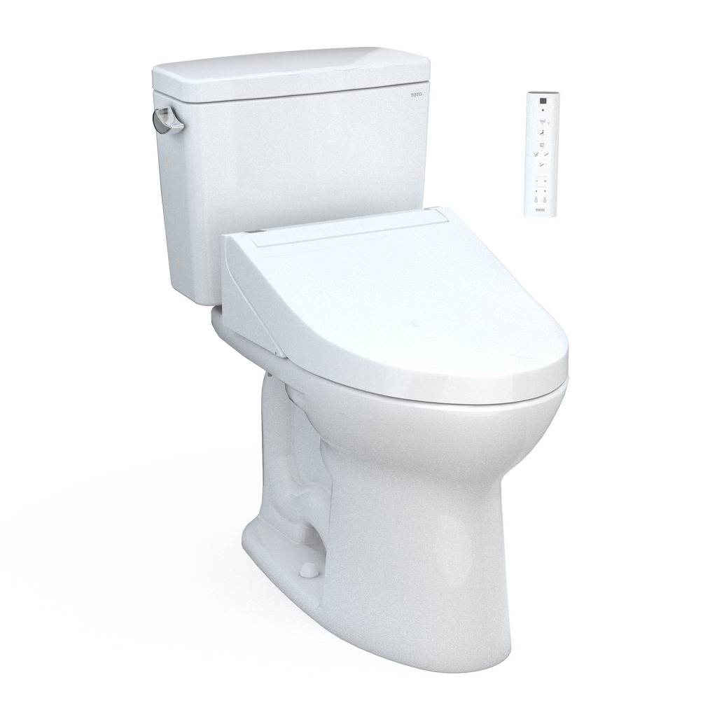 The TOTO Drake WASHLET + Two-Piece Elongated 1.6 GPF TORNADO FLUSH Toilet with C5 Bidet Seat is designed to conceal the WASHLET power cord and water supply hose for a seamless installation. Part of the newly redesigned C Series, the WASHLET C5 features a soft rear spray, rear cleanse, and front cleanse with the option of an oscillating or pulsating stream. The temperature and pressure of the water are adjustable, each with five settings. The controls are located on a slim, wireless remote. PREMIST wets the surface of the toilet bowl, aiding in the removal of waste and resulting in a better clean. The C5 model utilizes TOTO's EWATER+ system when the wand self-cleans. EWATER+ transforms the water into a safe and powerful compound, creating peace of mind by cleaning the inside and outside of the wand before and after every use. The WASHLET features a heated SoftClose seat with five temperature settings. The WASHLET features an air deodorizer and a warm air dryer with five temperature settings. The Drake features TOTOs TORNADO FLUSH, a rimless, hole-free design with dual-nozzles that creates a centrifugal washing action that assists in rinsing the bowl more efficiently. This version of the TOTO Drake includes CEFIONTECT, a layer of exceptionally smooth glaze that minimizes waste from sticking to the ceramic. CEFIONTECT, coupled with PREMIST and TORNADO FLUSH, assists to reduce the frequency of toilet cleanings, minimizing the usage of water, harsh chemicals, and time required for cleaning. This WASHLET+ toilet includes WASHLET, Drake bowl and tank set with hardware, and toilet bolt caps. Compatible with T40 WASHLET+ electronic bidet seat and toilet bowl components only. Additional items needed for installation must be purchased separately: wax ring, toilet mounting bolts, and toilet water supply lines.