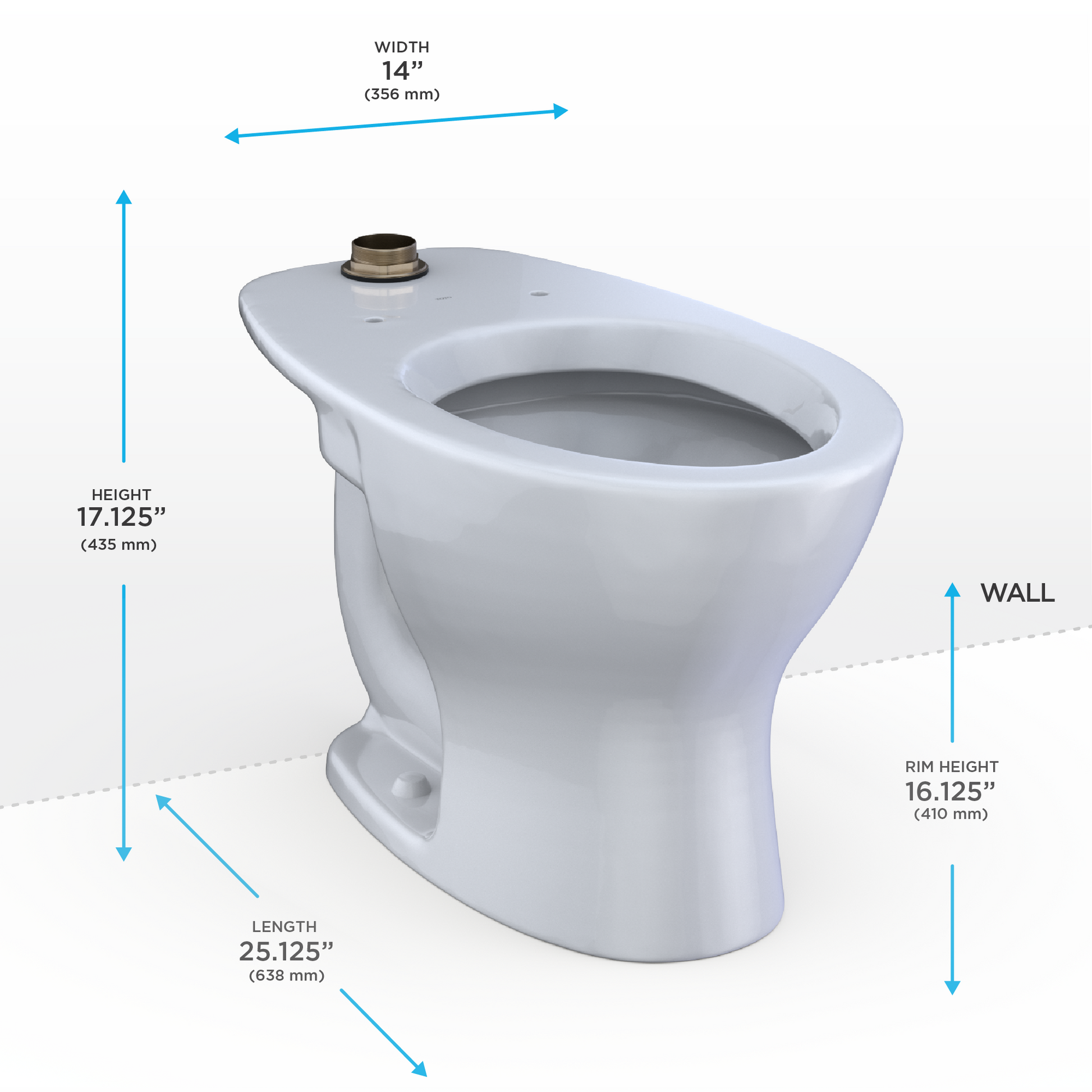 TOTOs TORNADO FLUSH Elongated floor-mounted ADA-compliant bowl exemplifies eco-friendly cleanliness and power in commercial spaces. Engineered for optimal performance along with the TOTO ECOPOWER flush valve, the toilet offers superior performance while saving water. Newly redesigned, this bowl features TOTOs TORNADO FLUSH, a rimless, hole-free design with dual-nozzles that create a centrifugal washing action that assists in rinsing the bowl more efficiently. TOTO's Universal Height allows for a more comfortable seat position across a wide range of users. The toilet bowl can be used in 10 to 12 inch rough-in installations and is WaterSense certified. Includes bowl and bolt caps. Flush valve purchased separately.