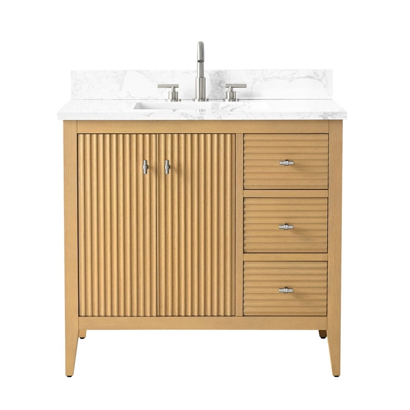 The Marlo vanity is crafted from durable, solid materials designed for long-term bathroom use. The engineered marble countertop resists moisture and daily wear while maintaining a refined appearance. A ceramic undermount sink offers durability and easy maintenance. Premium hinges and drawer glides support consistent performance and smooth operation over time.